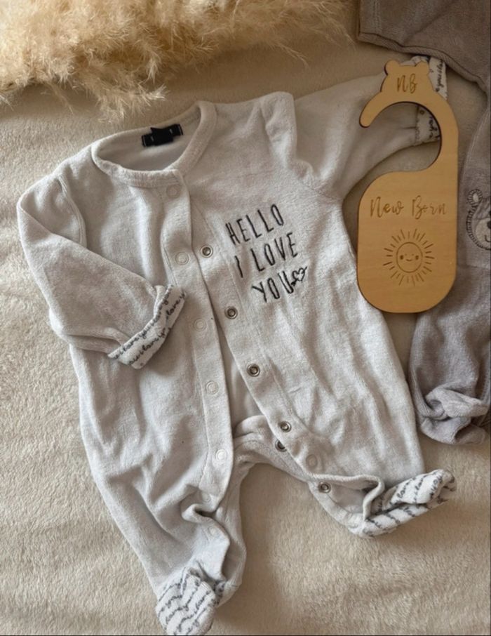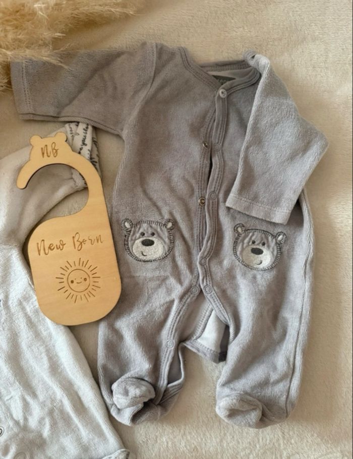 Lot de 2 pyjamas naissance L’un vient de chez Kiabi L’autre de chez Auchan Les deux ont bien servit, sont usés mais en parfait état général : pas de taches, toutes les pressions sont présentes