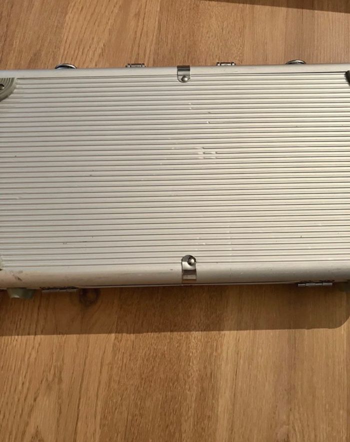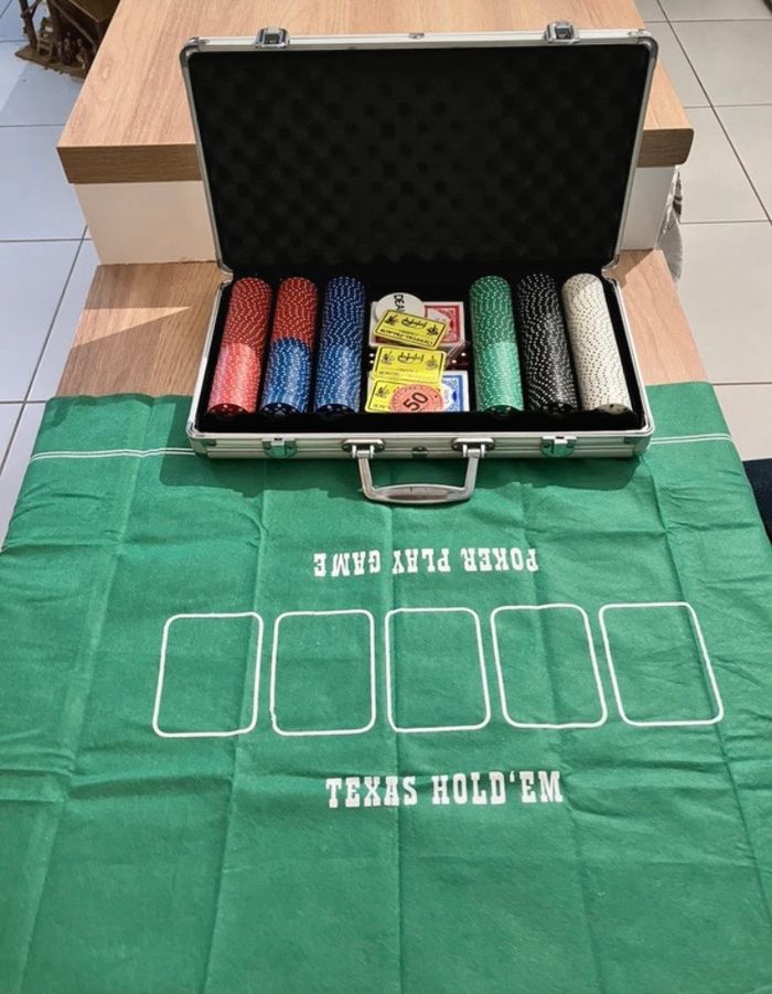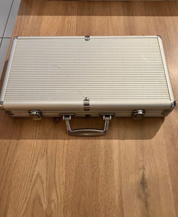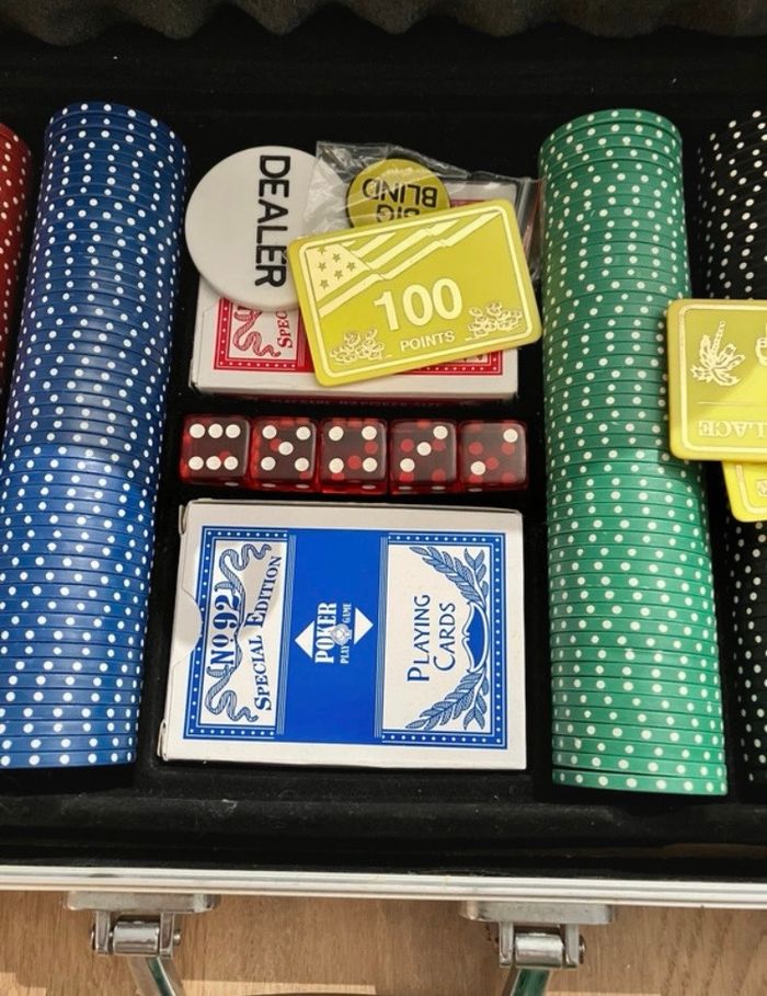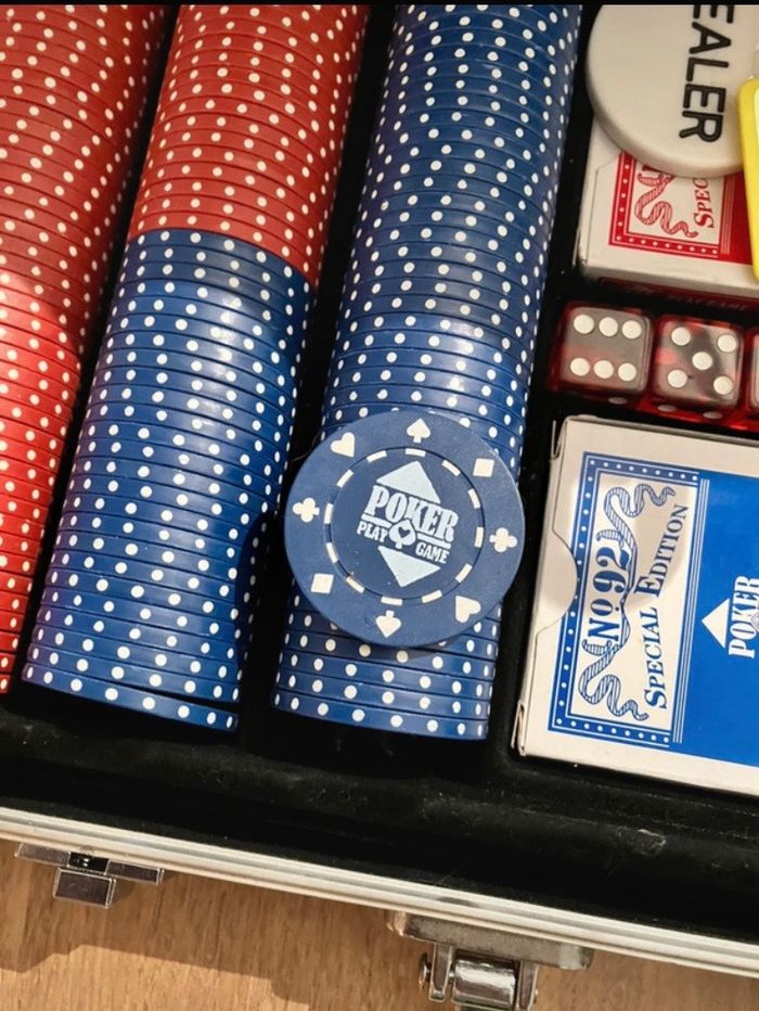 Malette de poker Excellent état neuf à l’intérieur! Jamais utilisé La Malette a quelques traces de choc (voir photos) dû au stockage 300 jetons 1 tapis 2 jeux de cartes 5 dés