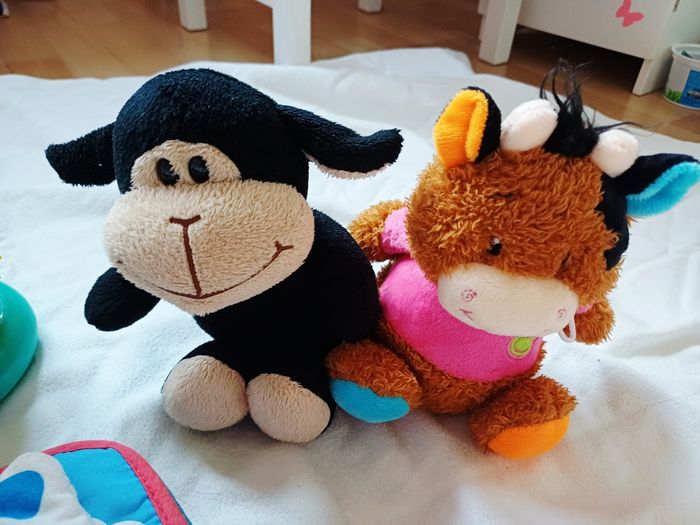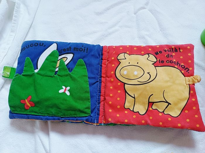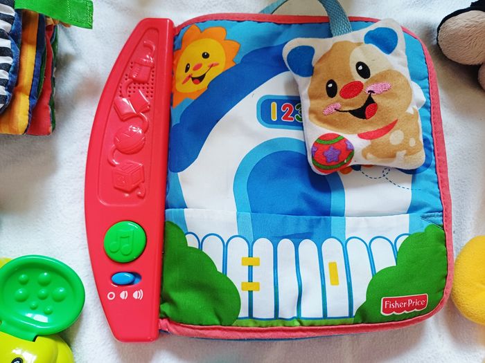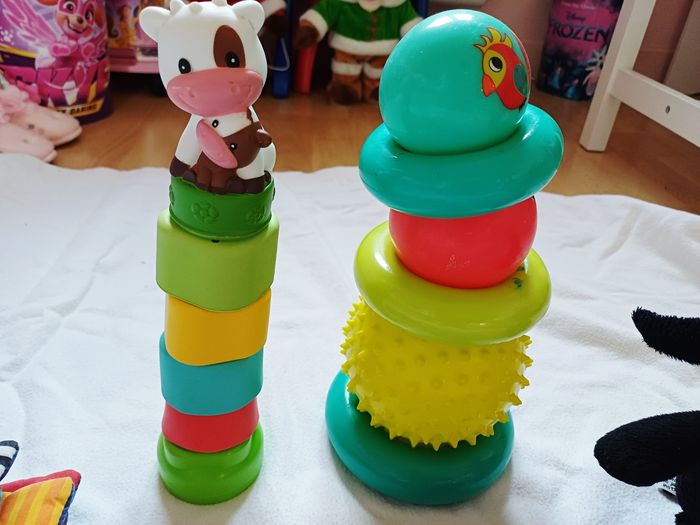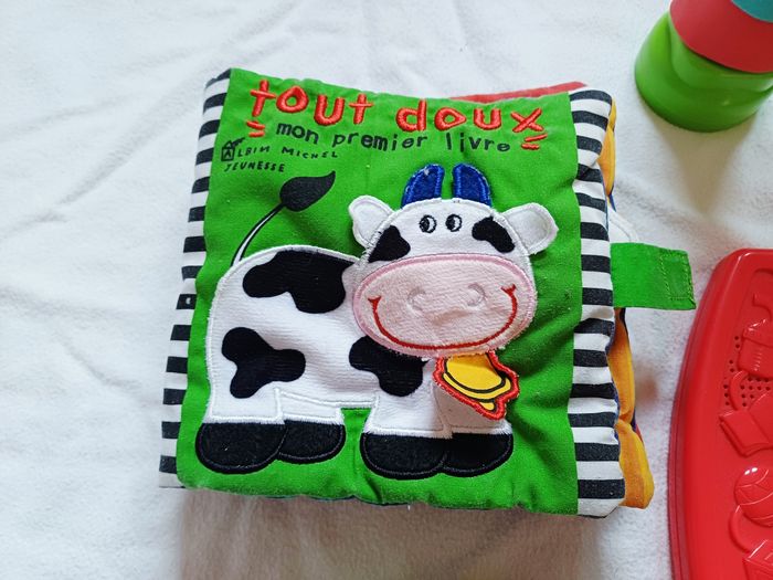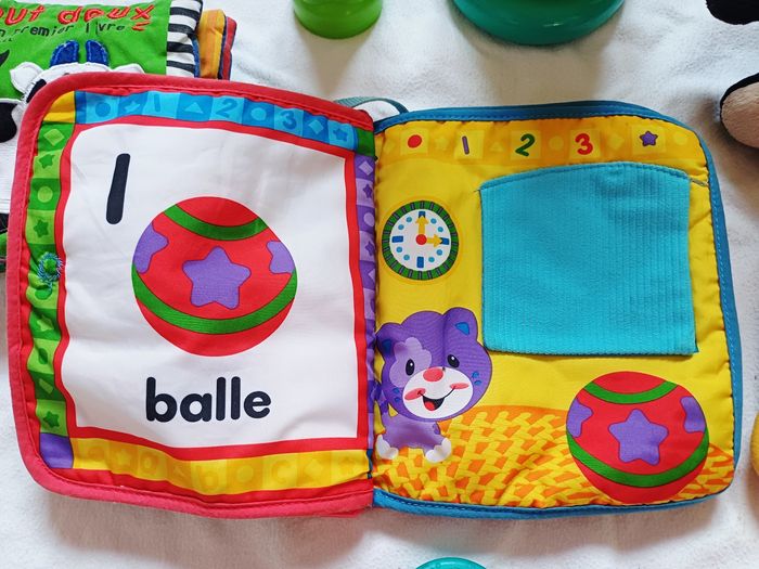 Vends Lot de jouets d'eveil Pour bébé Comprenant Un livre sensorielle en tissu et qui fait de la musique Un livre en tissu sensoriel Un jouet électronique souris verte Des logos souples avec une vache a empiler Des balles et des anneaux en plastiques souples sensorielles a empiler Un hochet de dentition 3 peluches L'ensemble en tres bon etat Prix 23 euros Maison non fumeur et sans animaux