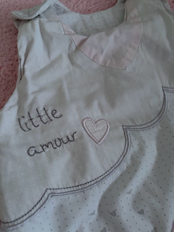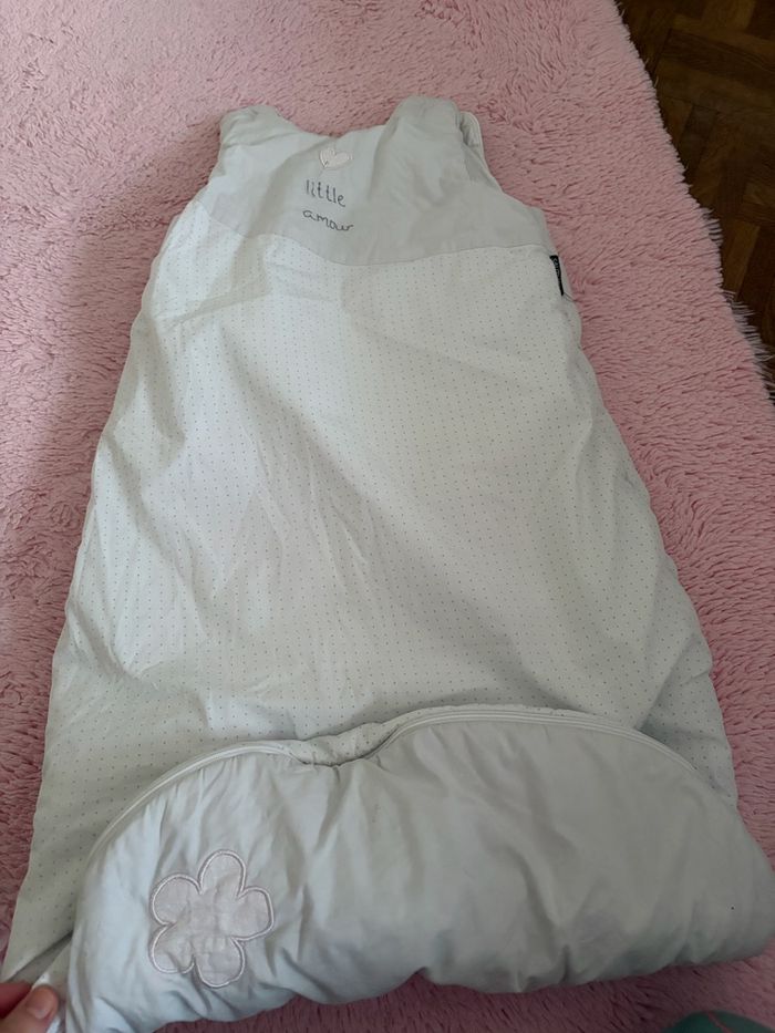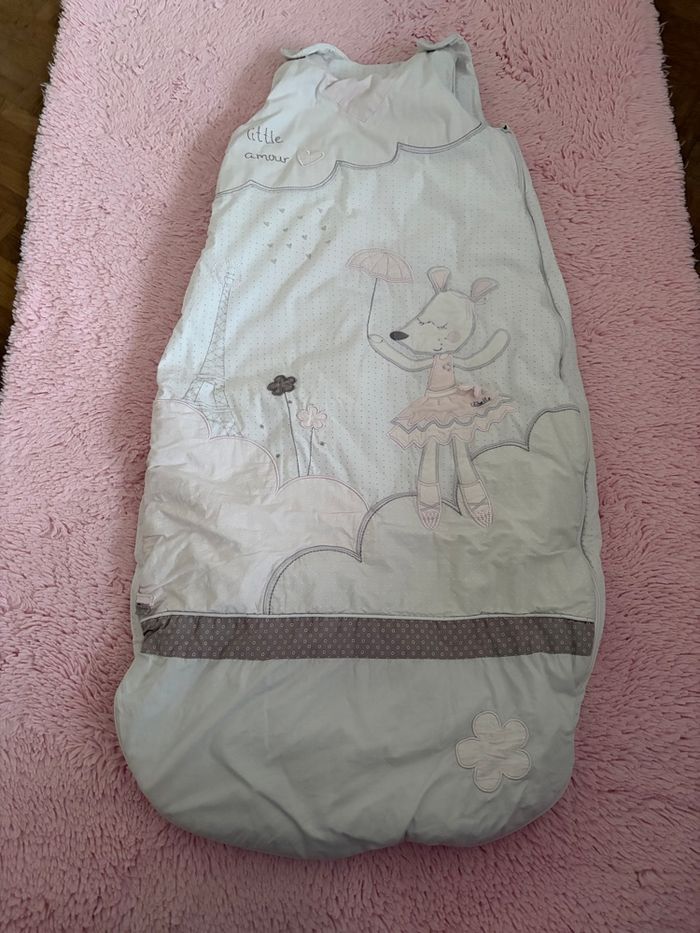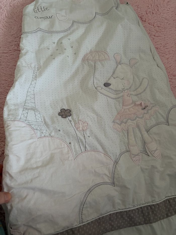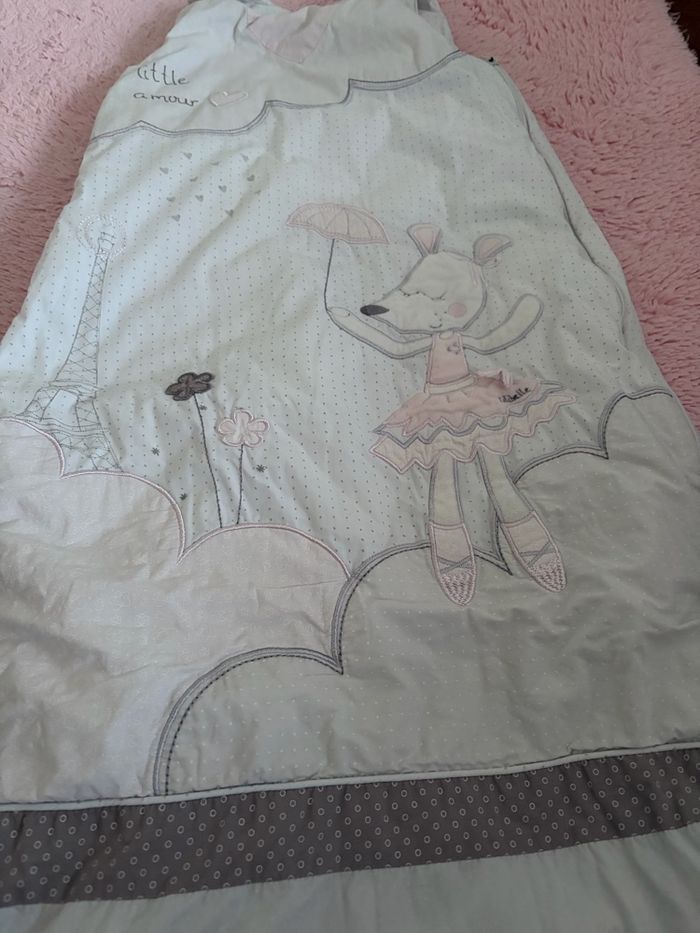 Gigoteuse en parfait état Fermeture ok Longueur 86cm elle a des pressions pour être réduite donc pour un petit bébé au départ Motif danseuse Tour Eiffel blanc et rose très jolie Little amour