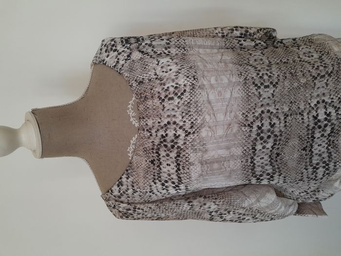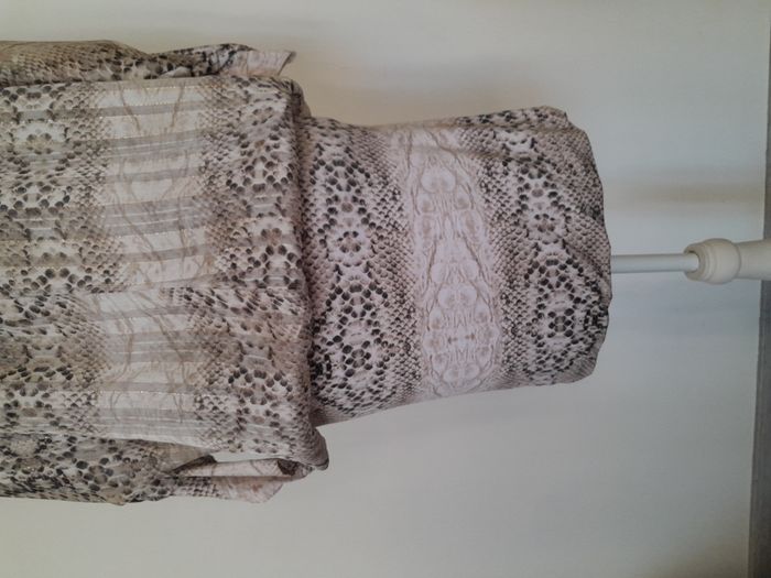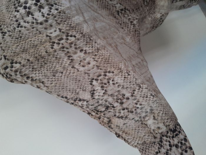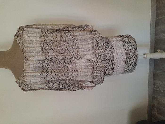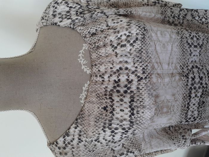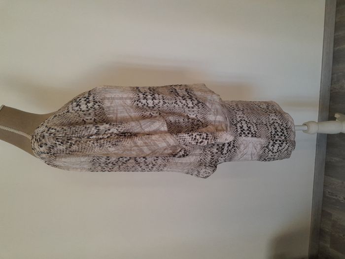 Robe, manche longue chauve souris, imprimé façon peau de serpent, évasé sur le haut, moulante sur le bas Longueur : 76cm Aiss / Aiss : 45cm Matière : 92 % Polyester, 8 % Elasthanne Marque : Made in France