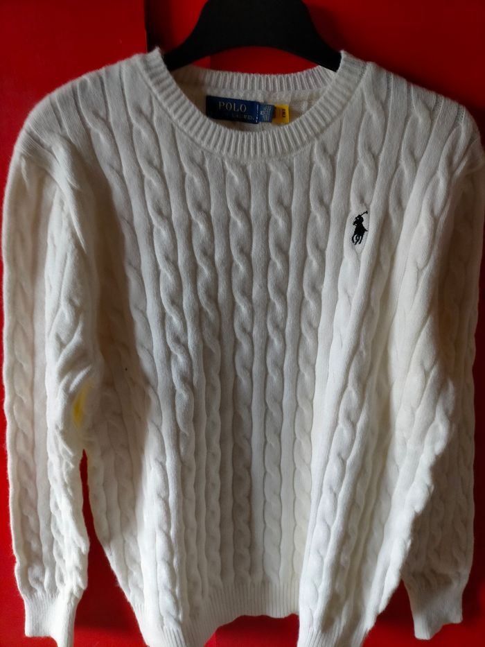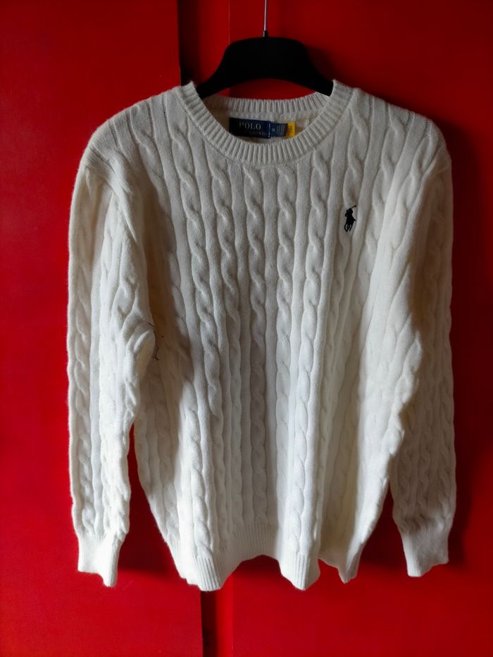 Jamais porté. Superbe pull en maille douce et chaude écrue avec broderie Pony player marine. Taille XL mais vraiment petit correspond à une taille L raison pour laquelle il n'a pas été porté. Authentique avec étiquette et flash code. Broderie du Pony player sur la torsade gage d'authenticité. Parfait pour un très beau cadeau à un prix raisonnable pour la marque
