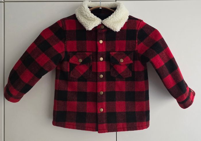 Veste de marque Bout'Chou, taille 24 mois, 57% coton, 37% laine, 5% acrylique, 1% polyamide. Motif carreaux dans les tons rouge / noir, 2 petites poches poitrine, fermeture par boutons pression.