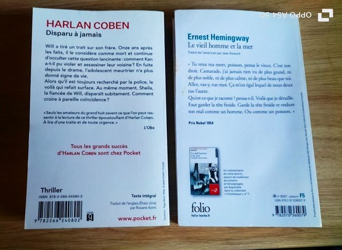 lot de 2 livres - Titre : Disparu à jamais - Auteur : Harlan Coben - Genre : Thriller - Titre : Le vieil homme et la mer - Auteur : Ernest Hemingway - Genre : Roman Très bon état juste une pliure sur la page rien de grave 5€ les 2