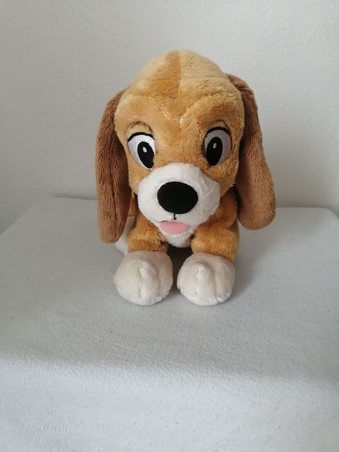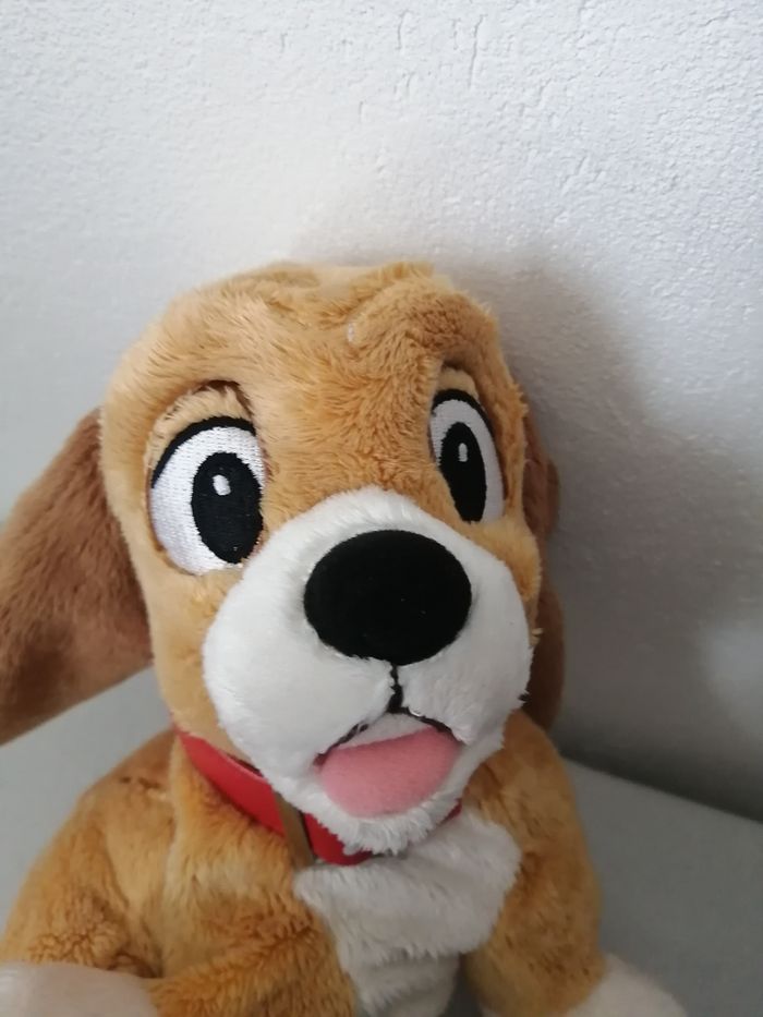 rouky peluche chien disney microbille intérieur au niveau des pattes petit accroc sur le collier à voir sur dernière photo environ 25 cm x 20 cm