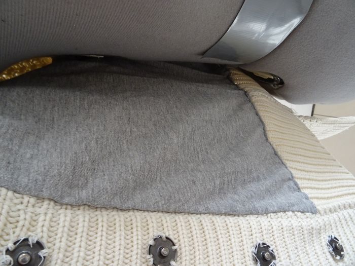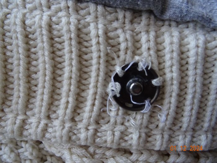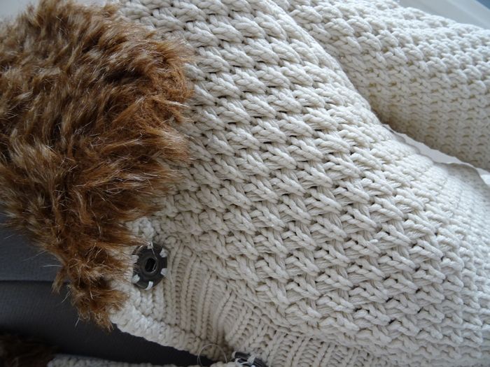 Veste "tricotée" beige avec doublure grise. Col en fausse fourrure. 2 poches latérales. Boutons pressions (la couture blanche d'origine des boutons est particulièrement moche donc à refaire) Tissu extérieur 100 % acrylique. Doublure 60 % coton 40 % polyester Longueur 58 cm