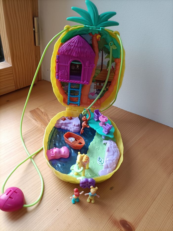 Polly pocket ananas sac à main surprises safari Mattel Dès 4 ans Vendu complet avec 1 girafe, 1 singe, 1 bateau, 2 personnages Nombreuses surprises et cachettes très bon état Envoi possible