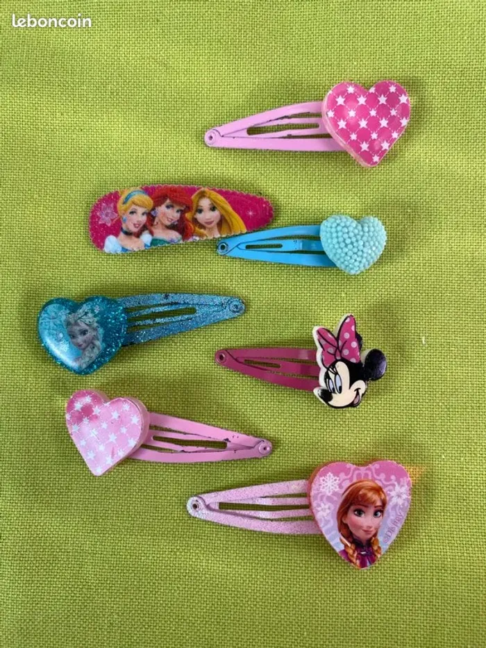 Je vends ce lot de pinces à cheveux pour enfants aux motifs colorés et ludiques. - Type de produit : Accessoire pour cheveux - Univers : Enfant - Matière : Plastique - Couleurs : Multicolore - Motifs : Princesses, coeurs, étoiles Très bon état
