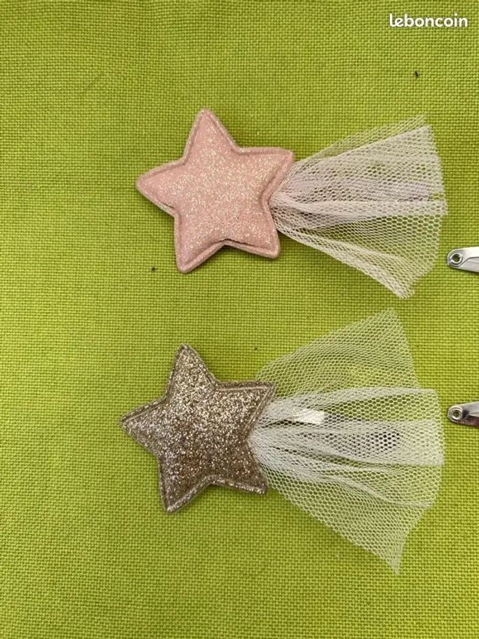 Je vends ces pinces à cheveux pailletées pour enfant. - Type de produit : Accessoire pour cheveux - Univers : Enfant - Matière : À paillettes - Couleur : Doré / Bronze / Cuivre - Fonctionnalités : Pinces avec étoiles pailletées Très bon état