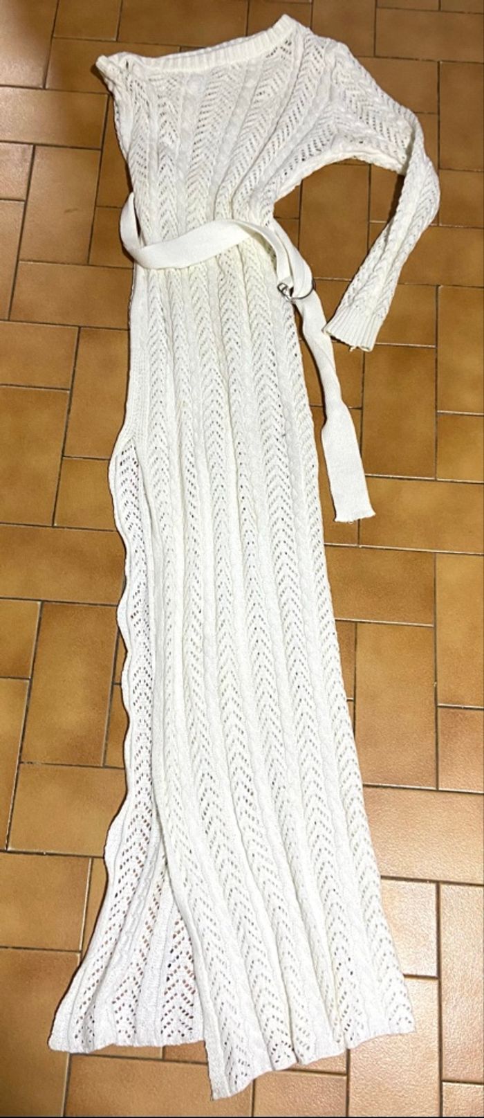 Robe de plage couleur blanc creme maille asymétrique une manche longue taille s avec ceinture bon état