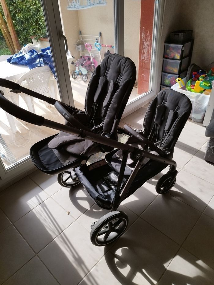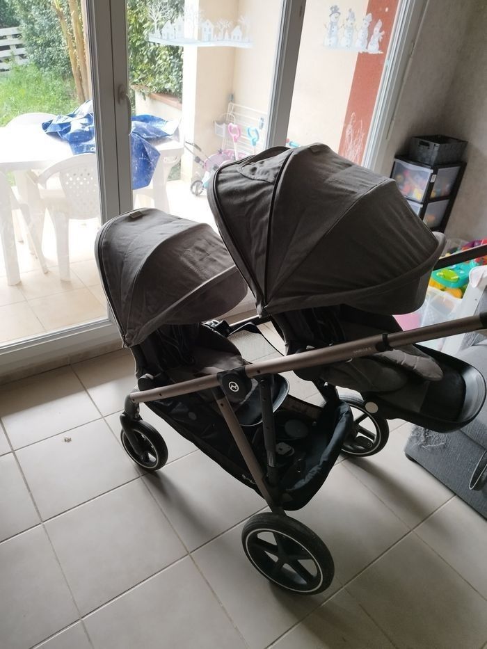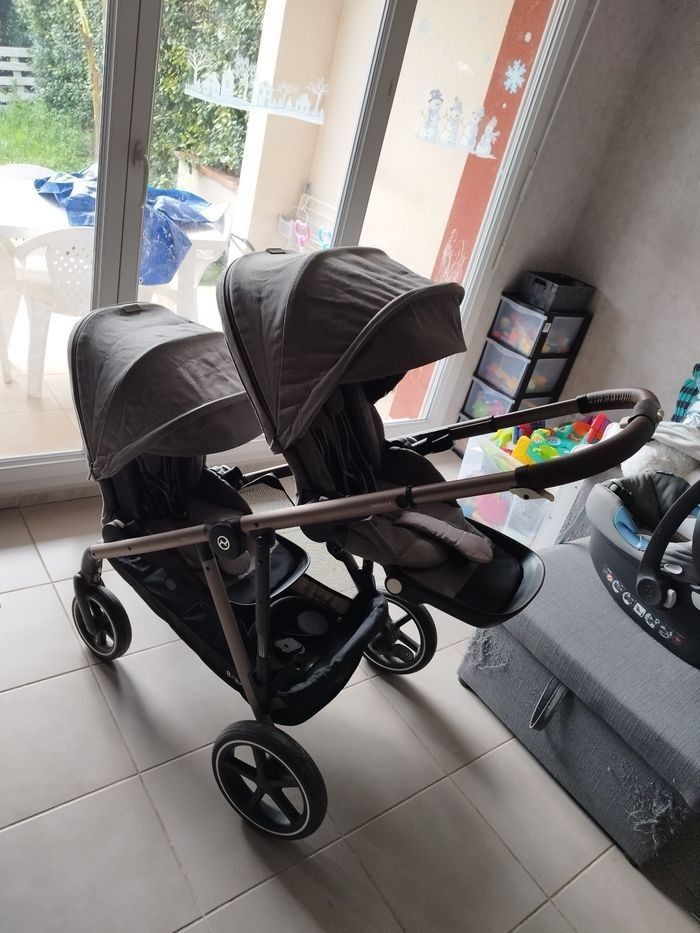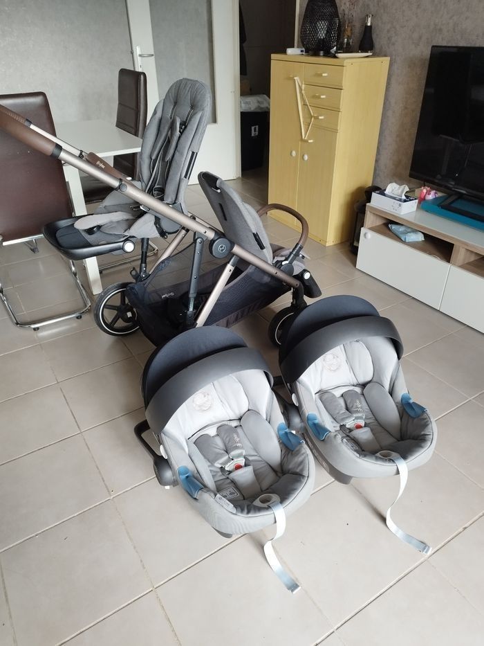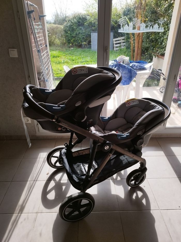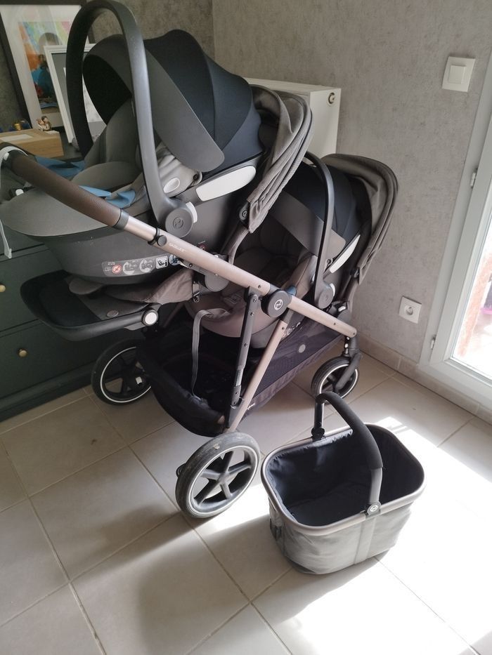 Poussette duo gazelle S finitions cuir Bon état Le châssis Le panier Deux coques Cybex Aton-M avec les adaptateurs pour la poussette 2 habillages de pluies pour les coques 2 assises avec leurs capotes amovibles 1 roue avant de change Possibilité d'acheter les éléments séparément en me contactant par la messagerie