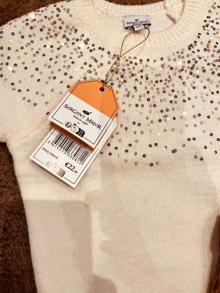 Robe velours vertbaudet tbe, camel, bretelles réglables Collant sergent-major 23-24, tbe, mis et lavé 1 fois Pull neuf à sequins sergent-major, crème