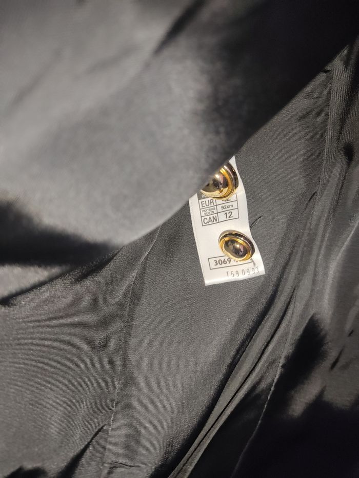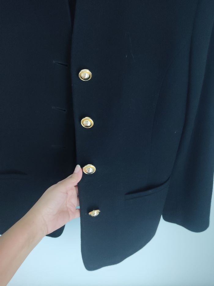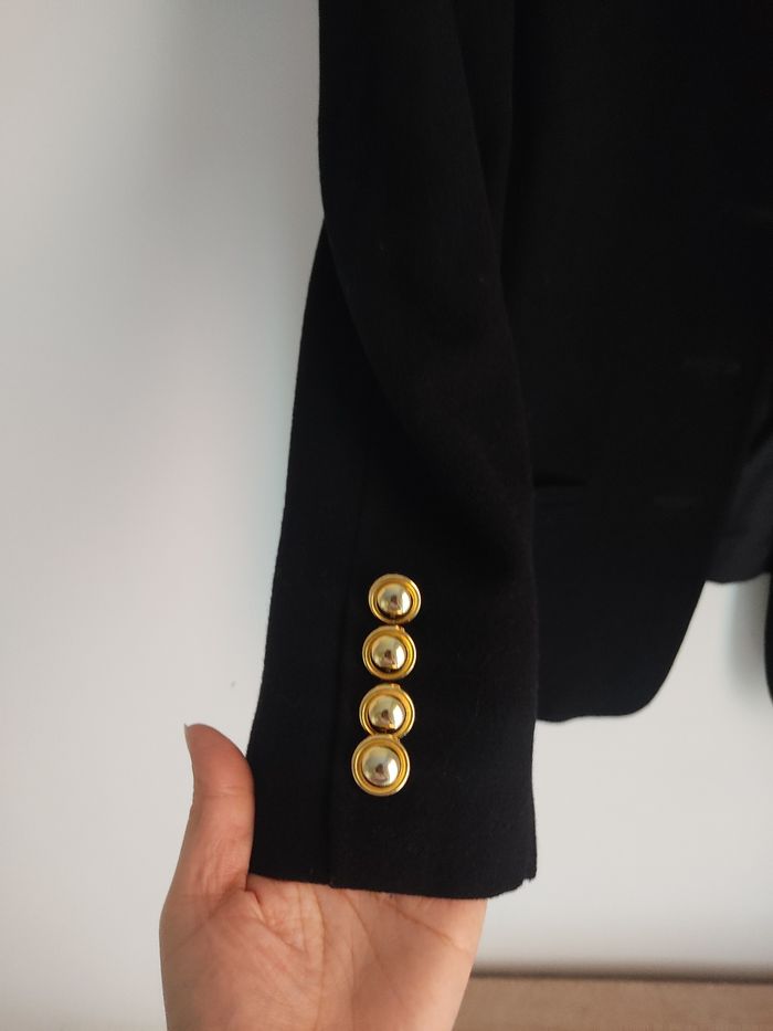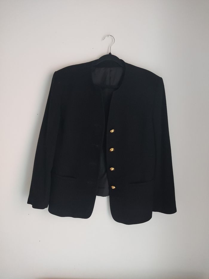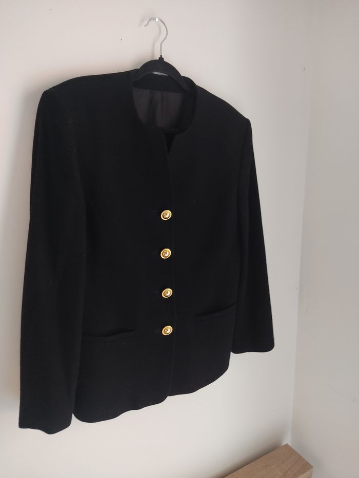 Veste / blazer noir en laine – élégante et intemporelle Très belle veste noire composée à 80 % de laine, idéale pour la mi-saison et l’hiver. Coupe chic et structurée avec de jolis boutons dorés qui apportent une touche sophistiquée. Facile à associer, aussi bien avec un jean qu’un pantalon habillé. ✔ Matière majoritairement en laine, chaude et confortable ✔ Coupe élégante et flatteuse ✔ Poches discrètes ✔ État : excellent état, comme neuve Parfaite pour un look classique et raffiné.