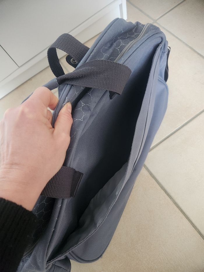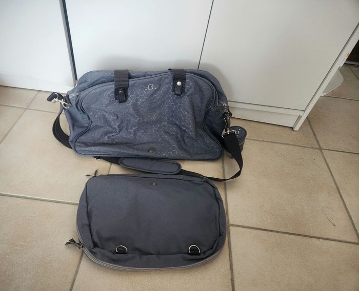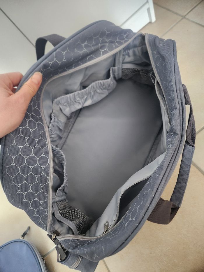 En très bon état. Pochette amovible avec petit tapis à langer nomade (légèrement tâche voir photos), un coin légèrement râpé (voir photo) Plus porte tétine amovible. Pratique car léger et plein de poches. Couleur bleu gris. Maison non-fumeur