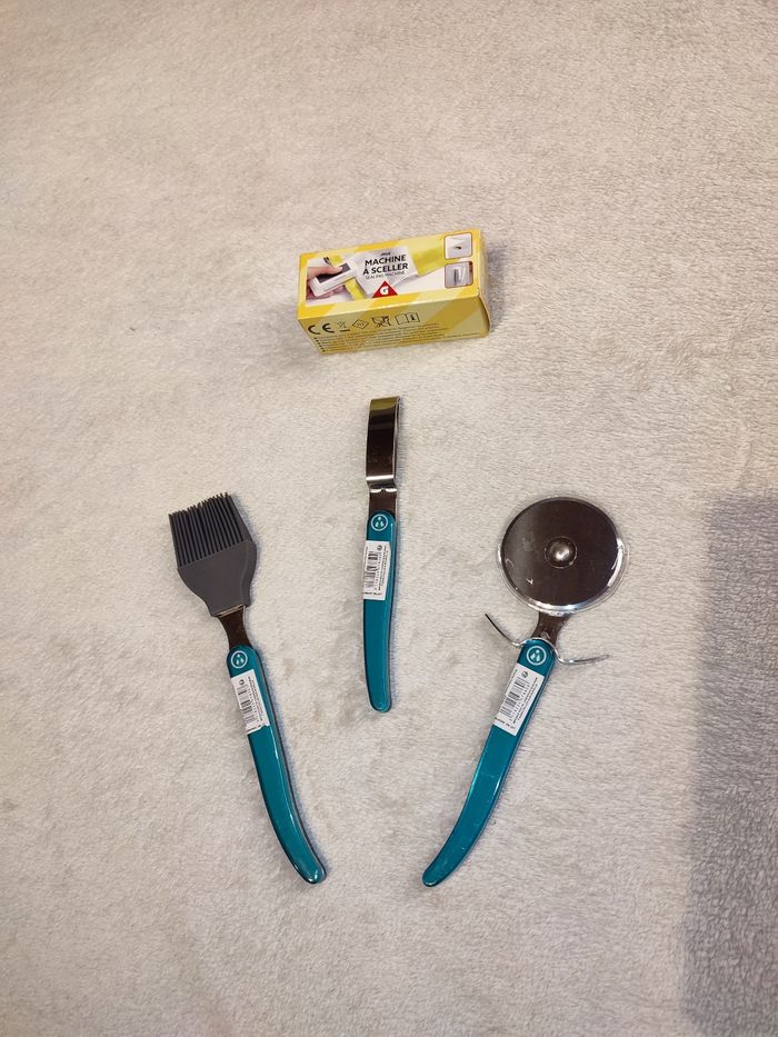 Je vends ce lot d'ustensiles de cuisine neufs, encore avec les plastiques de protection et les étiquettes. - une machine à sceller Gifi - un éplucheur Laguiole - une roulette à couper Laguiole - un pinceau silicone Laguiole Les 3 ustensiles passent au lave vaisselle. 12€ le lot Envoi rapide 📦