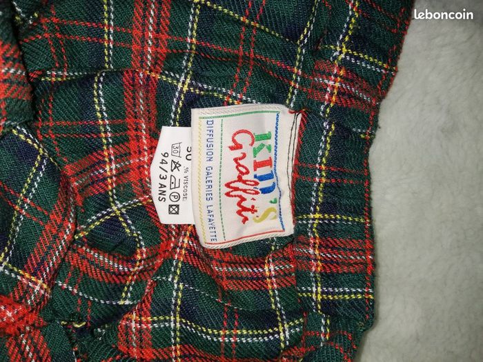 -Jupe plissée enfant. Écossaise. Taille 3ans,94cm.KID'S Graffiti de Galeries Lafayette. Fermeture par 1 bouton devant à la taille. 50% polyester, 50% viscose.