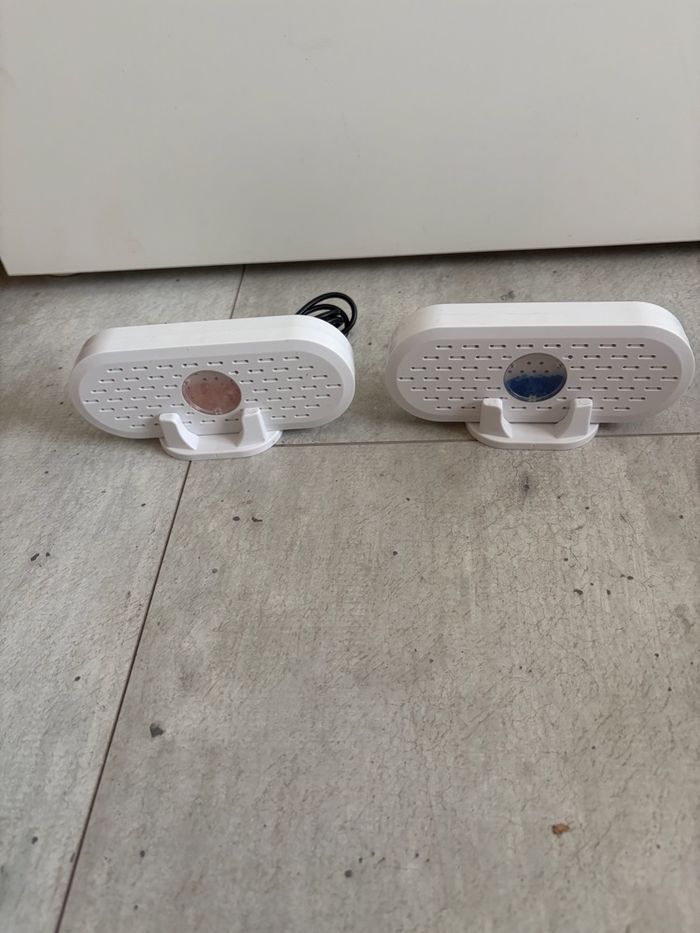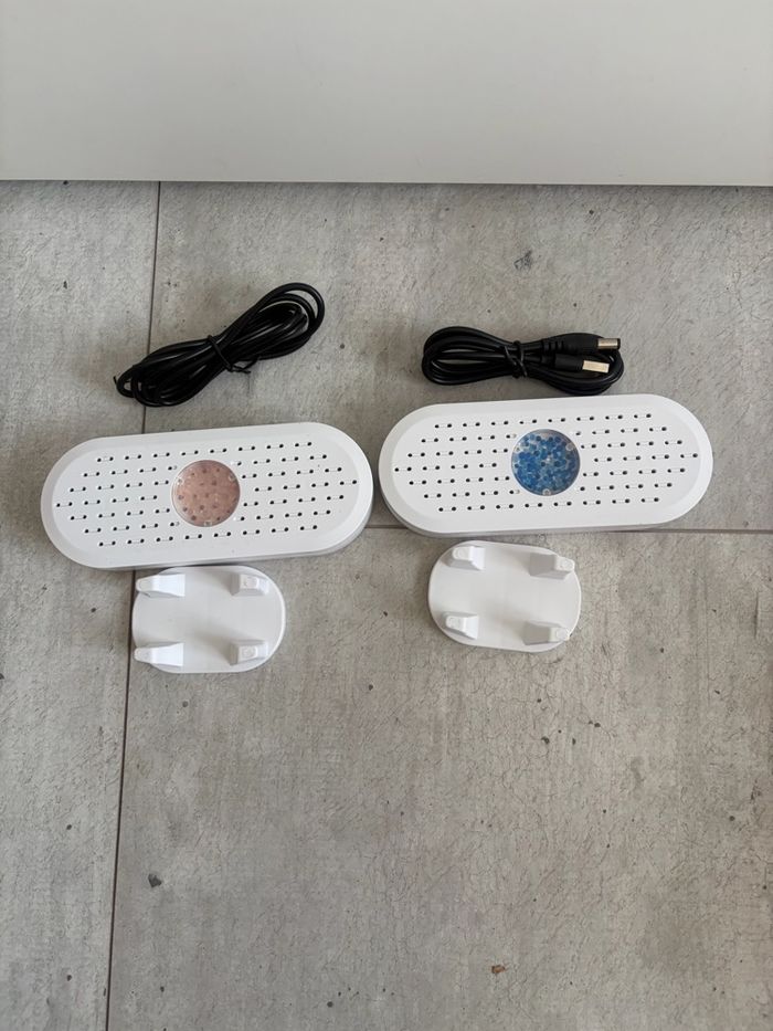 Je vends ce lot de 2 déshumidificateurs rechargeables. Ces appareils compacts et pratiques sont idéaux pour maintenir une humidité saine dans un placard. - Type de produit : Déshumidificateur rechargeable - Marque : Autre - Accessoires inclus : Câbles d'alimentation et support - Dimensions : environ 15 x 6 cm - Les billes sont roses lorsqu’elles sont chargés en humidité et bleu lorsque vous les recharger Très bon état N'hésitez pas à me contacter pour plus d'informations ! Envoie rapide et soigné