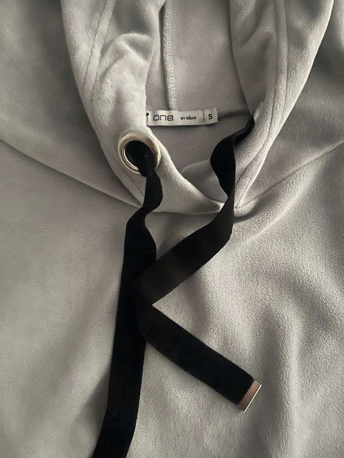 Sweat à capuche court gris clair, coupe moderne et tendance. Modèle One by Gémo, taille S. 🖤 Détail sympa : lien large noir style ruban au niveau de la capuche avec œillets métalliques, ça change des cordons classiques et donne un look plus stylé. 👕 Coupe : • Longueur courte (cropped) • Manches longues • Matière douce et confortable, effet légèrement suédée à l’extérieur 📌 État : Bon état général. À noter un petit accroc discret dans le tissu (voir photo de près), peu visible porté mais pris en compte dans le prix. 🎨 Couleur : gris clair, facile à assortir (jean, legging, jogging, etc.) 🏷 Taille : S 🏢 Marque : One by Gémo Parfait pour un look casual / sport chic 🌿