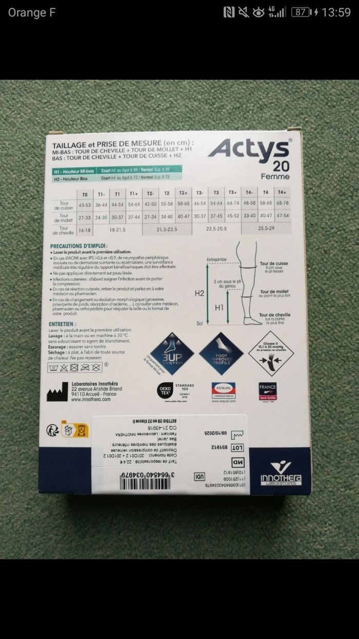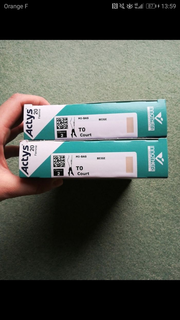 Lot de 2 paires de mis-bas de compression médicale, taille 0, couleur beige, neufs dans leur boîte. Marque Actys 20 femme. 10€ les 2. Possibilité de vendre à l'unité, 5€.