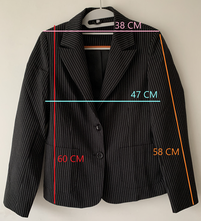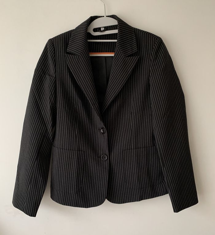Blazer noir rayé blanc Taille : 40 Matière : Polyester - Viscose - Elasthanne Longueur : 60 cm - Largeur épaules : 38 cm Porté une fois