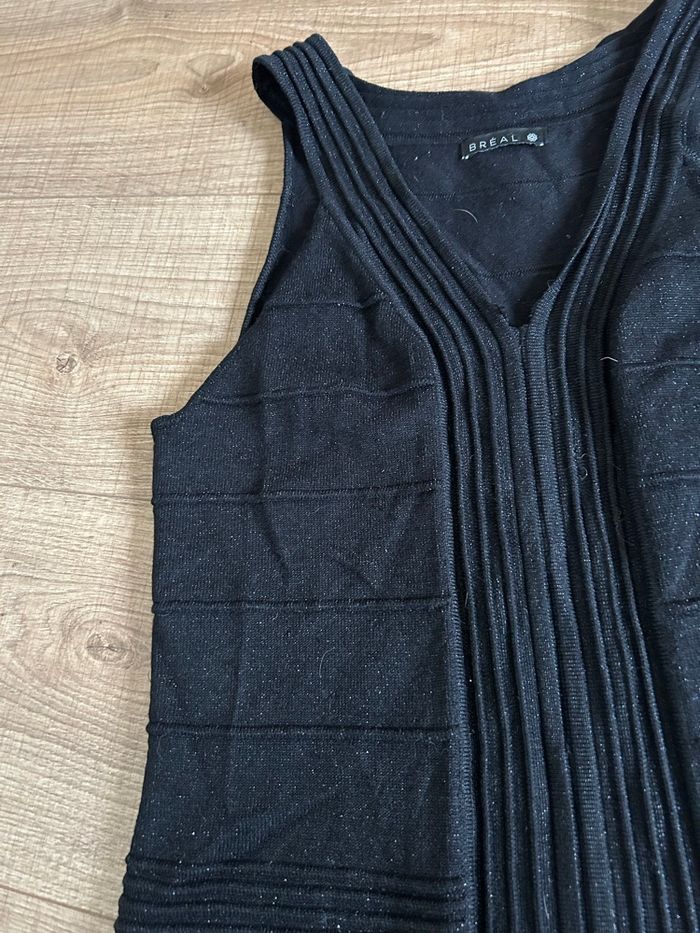 Jolie robe noire pailletée sans manches, de marque Breal. Correspond à une taille 38 (étiquette de taille coupée, voir mesures en dessous). Portée quelques fois, en très bon état. aisselle à aisselle 43 cms et plus taille 38 cms et plus longueur depuis épaule 94 cms Le tissu est extensible Étiquette intérieure de composition coupée