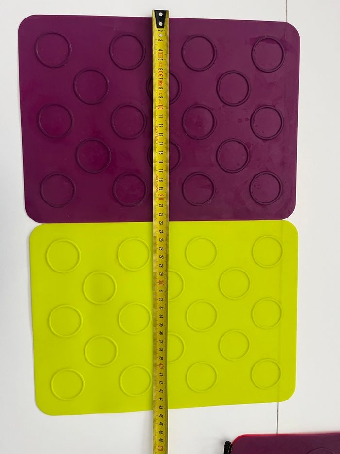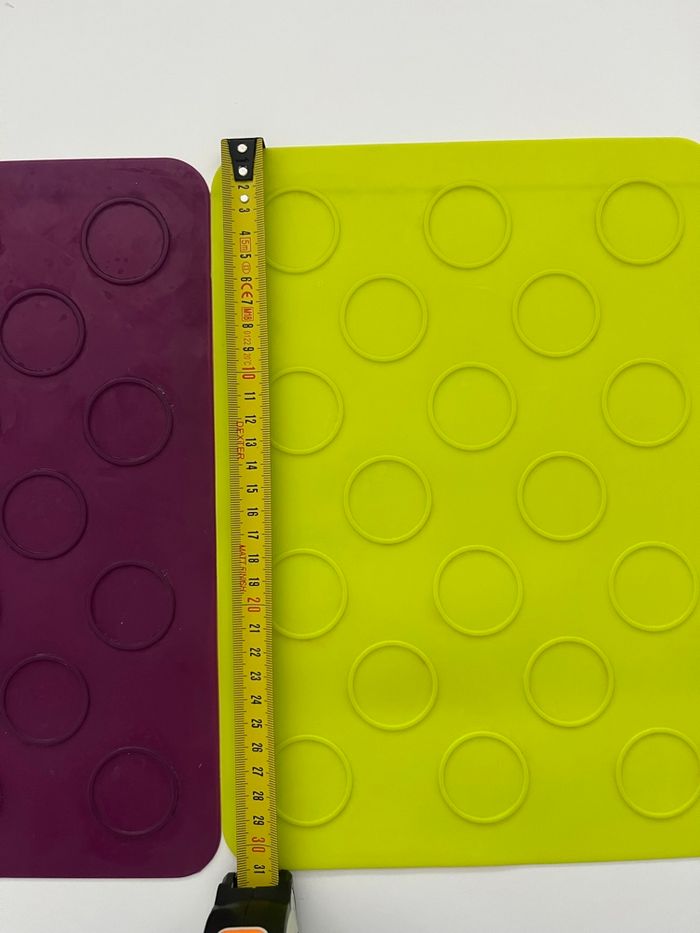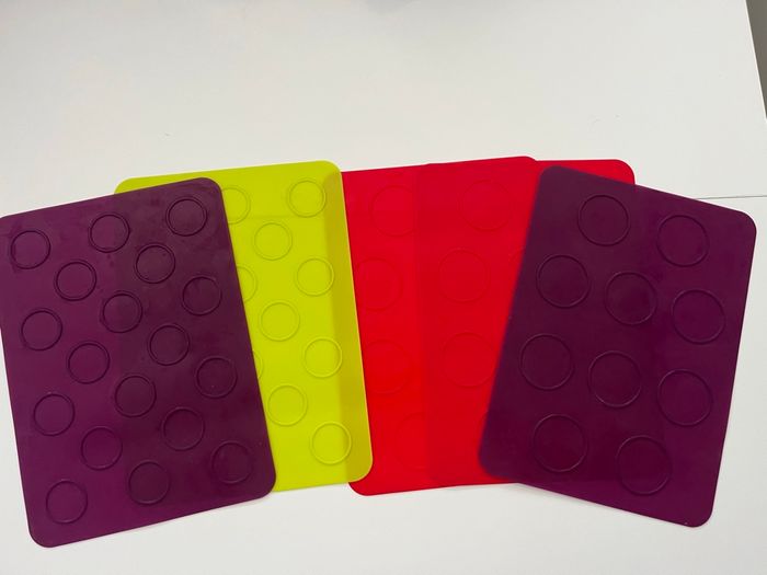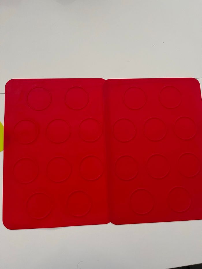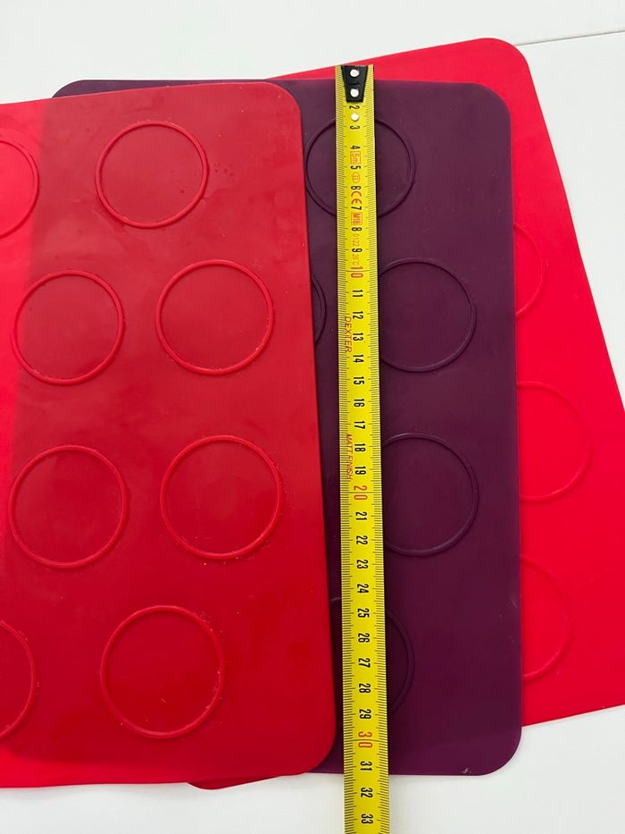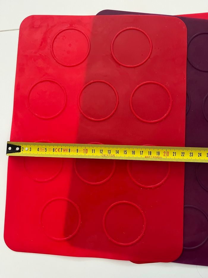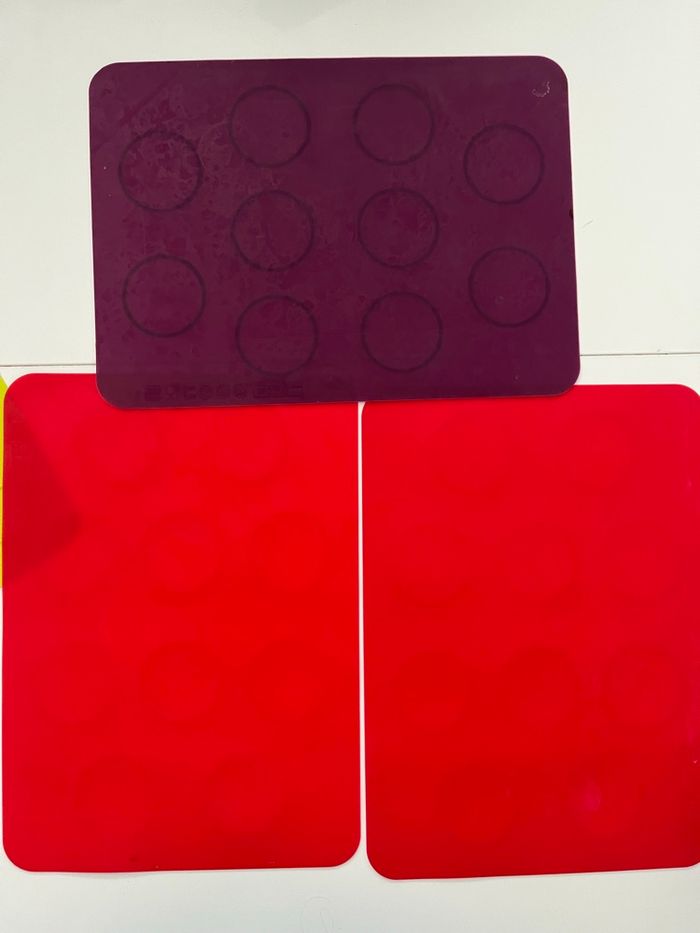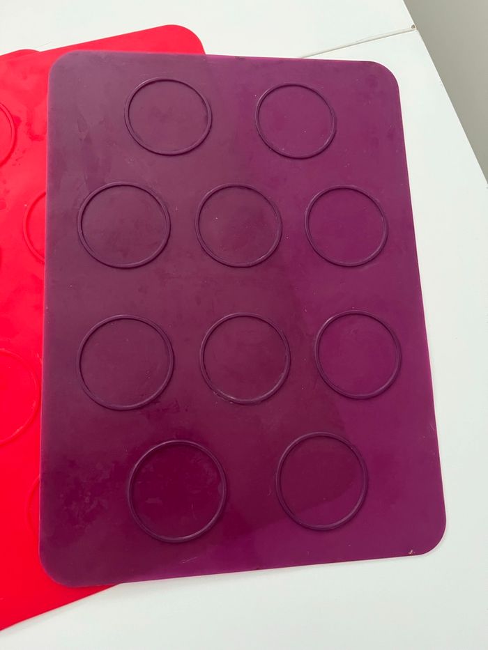 lot de tapis de cuisson en silicone alimentaire avec empreintes rondes. 🔸 Idéal pour : macarons, biscuits, whoopies, coques en chocolat, petits gâteaux bien réguliers. 🔸 Détails : • Matière : silicone souple, réutilisable • Couleurs : violet, rouge et vert • Empreintes rondes pour des formes bien uniformes • Dimensions visibles sur les photos avec le mètre (environ format plaque de four) • Passent au four et se nettoient facilement 🔸 État : Bon état général. Traces d’utilisation normales (petites marques/taches), mais parfaitement fonctionnels. Parfait pour les amateurs de pâtisserie maison 🍪