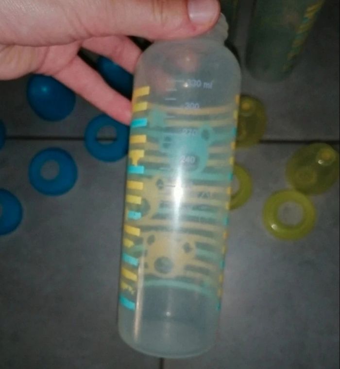 Vend lots de 6 biberons. Les dessins s'efface à la longue d'être laver. Marque sur un biberon et un bouchon jaune avec un morceau de casser mais ne gêne en rien son utilisation.