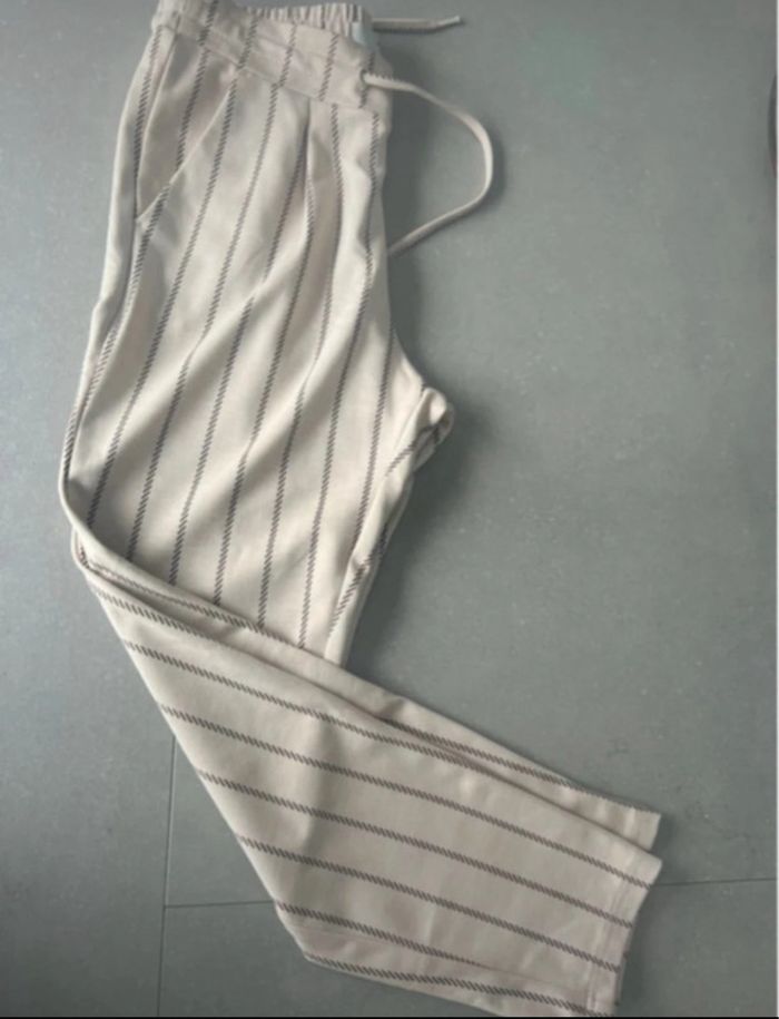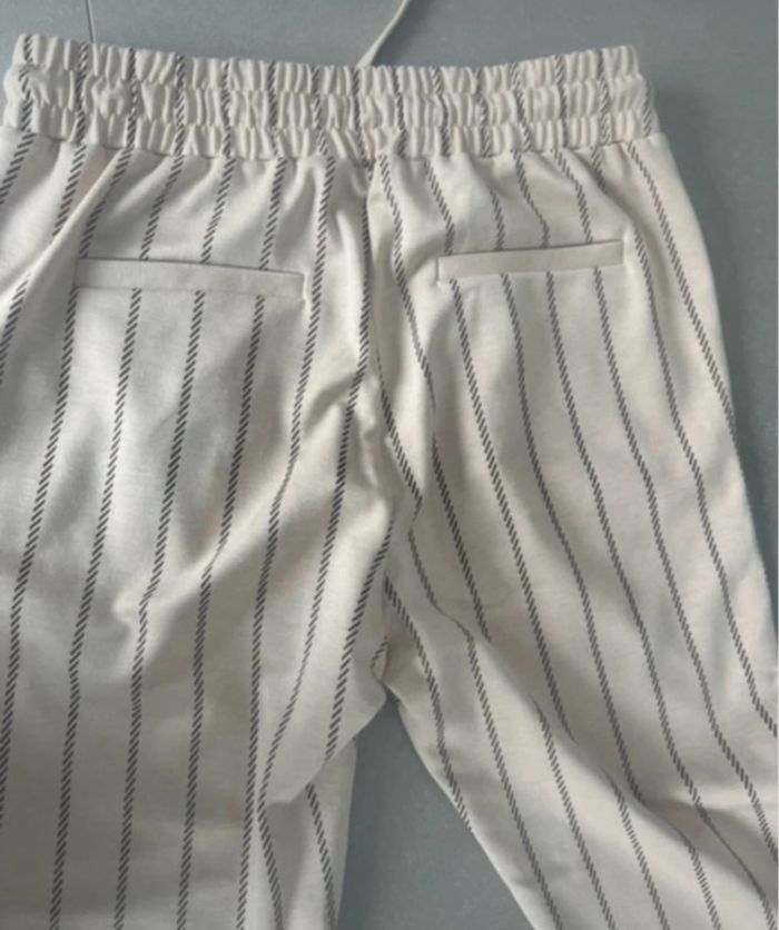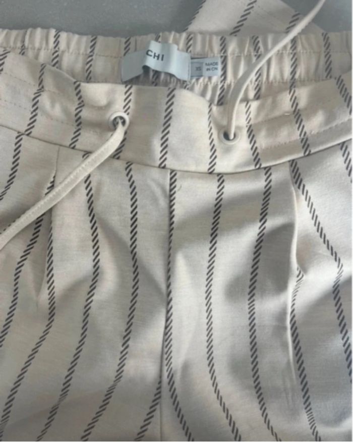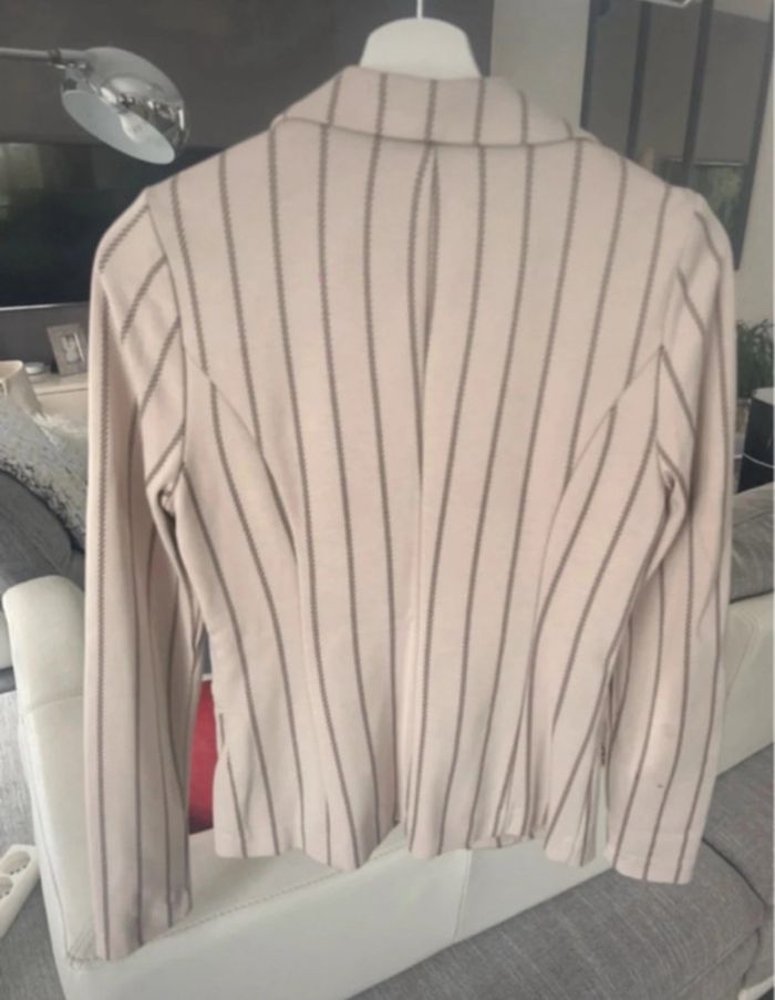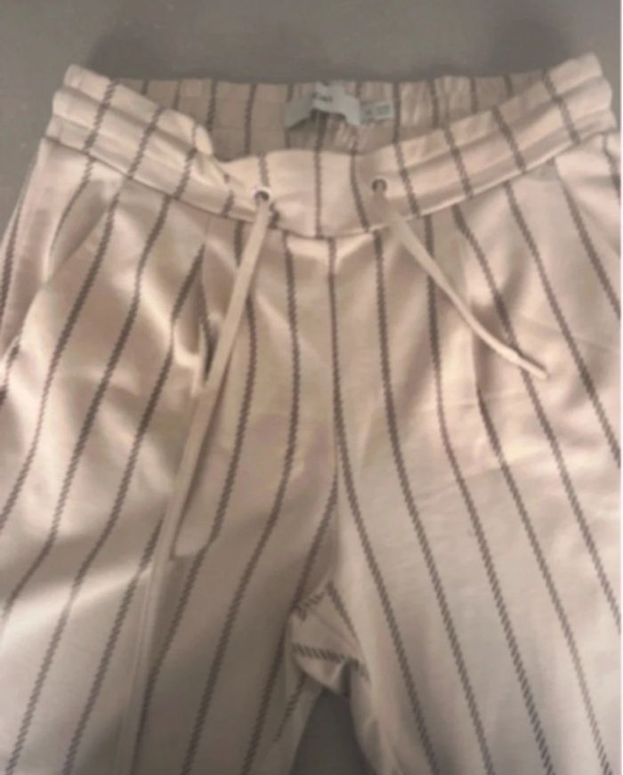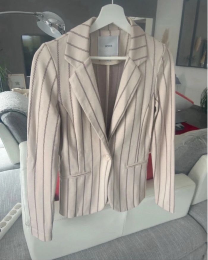 Tailleur blazer Pantalon ICHI beige rosée à fines rayures marron Idéal pour un mariage ou une occasion veste légère avec 2 fausses poches devant pantalon à pinces droit ceinture élastique lien devant fausses poches à l'arrière Taille XS état neuf peut être offert