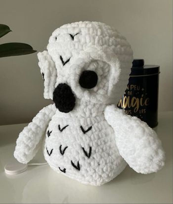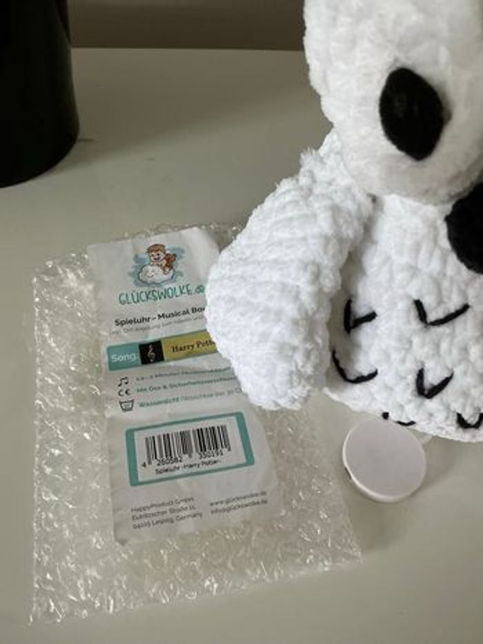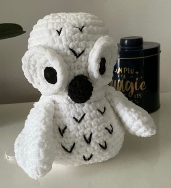 Doudou boîte à musique La petite chouette est réalisé au crochet avec un fil tout doux (fil chenille) La boîte à musique est insérée dans le corps de la jolie petite chouette. Elle est étanche, la mélodie, sur le thème ”Harry Potter”, dure environ 2 minutes. La chouette ou hibou mesure 20cm entretien : lavage à la main ou en machine maxi 30° programme laine/délicat séchage à plat / ne pas mettre au sèche-linge / ne pas repasser Chaque création est issue d'un travail minutieux au crochet et sera donc unique en son genre. Chaque pièces demandent plusieurs heures de travail. Comme toute confection artisanale, les dimensions peuvent légèrement variées d’un article à l’autre et les couleurs peuvent être légèrement différentes (en fonction de la prise de vue)