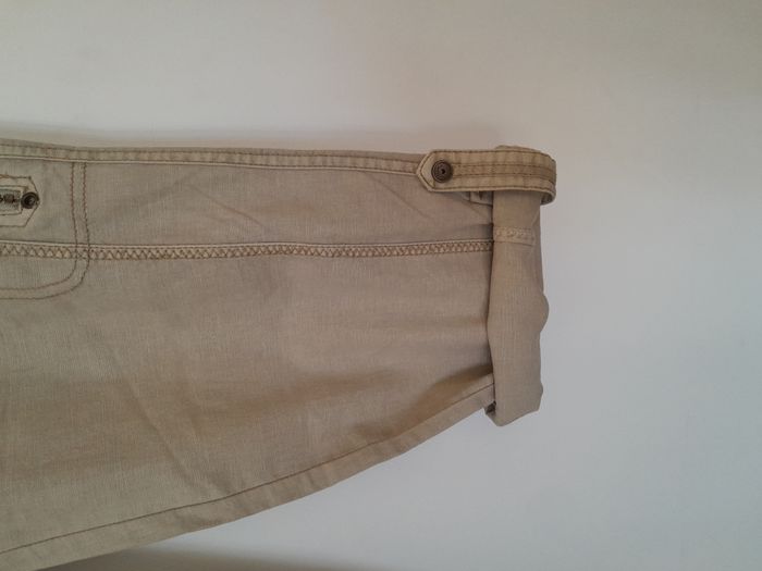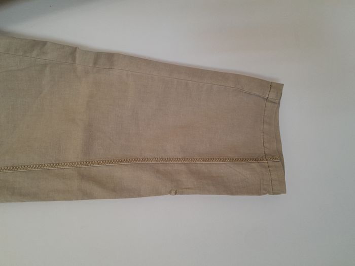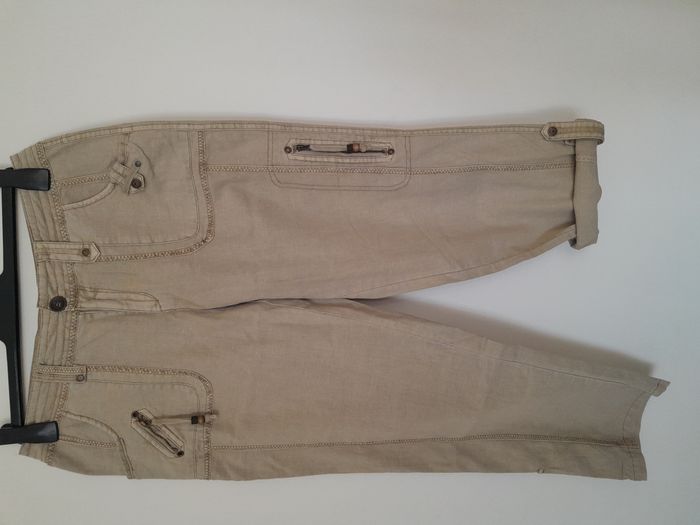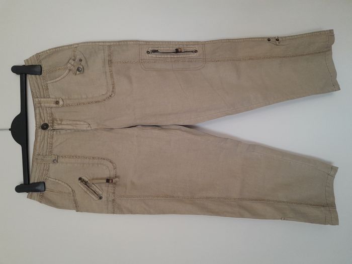 Pantalon, jambe large, possibilité pantacourt, 5 poche donc 2 fausse derrière Longueur : 92cm, pantacourt : 80cm Taille en cm : 40 Matière : 55 % Lin, 45 % Coton