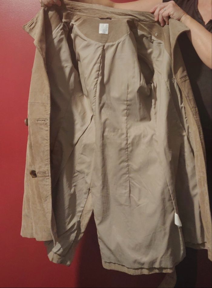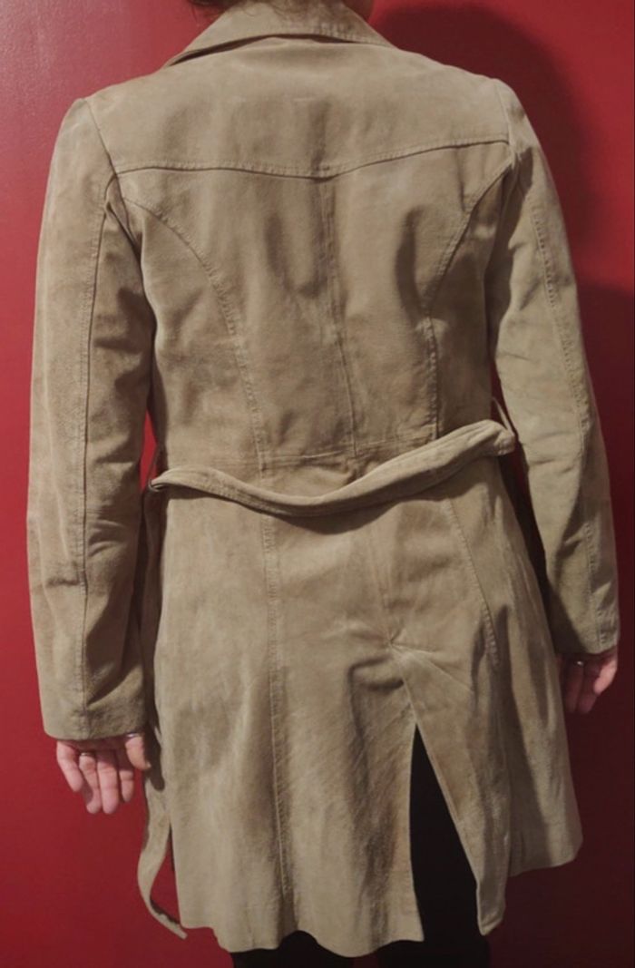 longue veste (genoux)avec ceinture 100% en croûte de cuir taille 38 couleur : marron clair doublure nickel 100% polyester