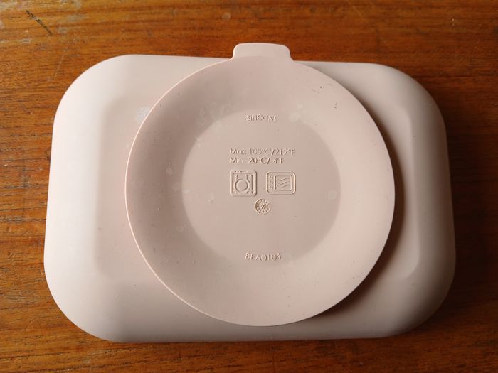 Assiette pour bébé en silicone rose pale. 3 compartiments. Ventouse pour la fixer a la table. Neuve, jamais servi