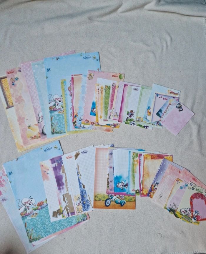 Il y a 2 lots de feuilles diddl, un composé de 31 feuilles intact et sans double et un autre composé de 47 feuilles avec défauts (feutre magique, déchiré, plier). Il y a en tout 78 feuilles diddl vintage ✈️Envoyer dans un carton pour être sûr qu'elle arrive intact