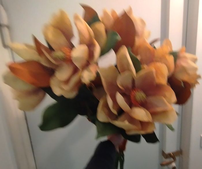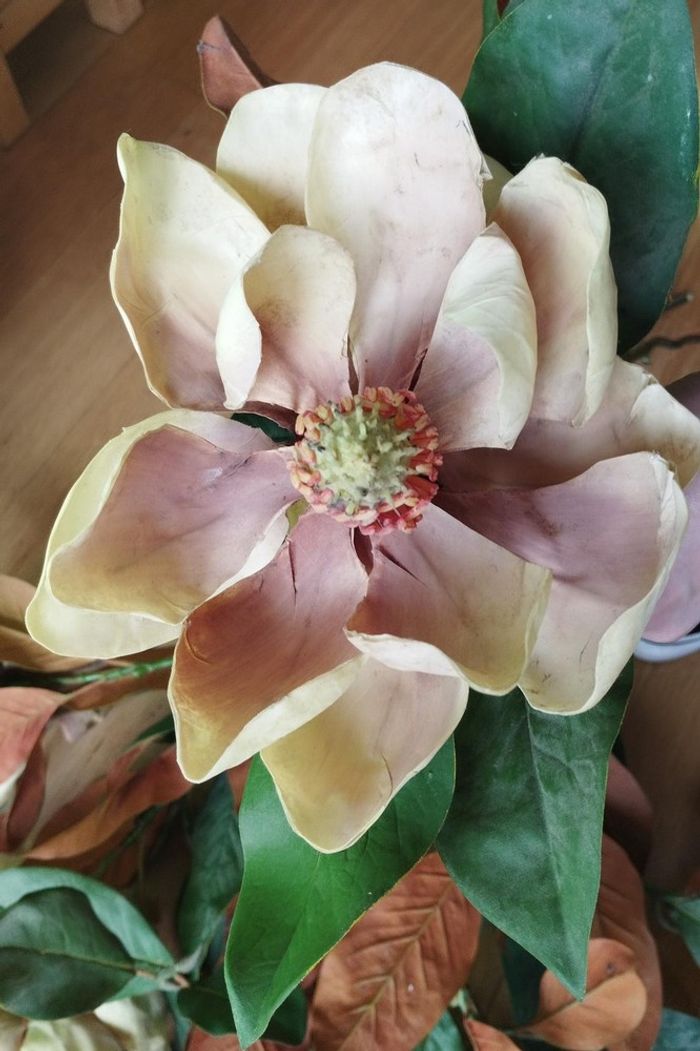Bouquet de 6 tiges de fleurs artificielles de marque Sia Magnolia tons beige jaune, feuillage verte / orange ocre Longueur totale 90 cm Les fleurs et feuilles ont été nettoyées et dépoussiérées, mais reste quelques traces Les tiges pourront être pliées pour faciliter le transport