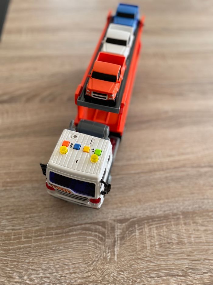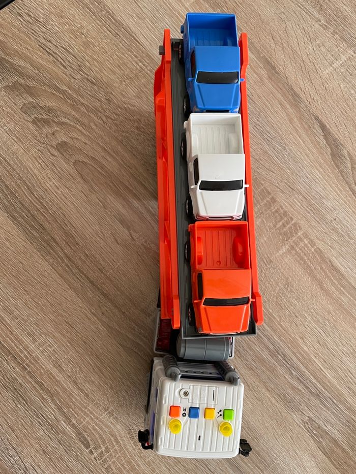Camion transporteur avec ces 3 voitures Action En très bon état fonctionne très bien
