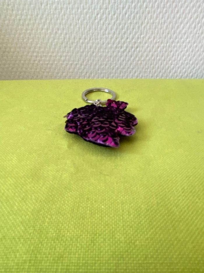 Je vends ce porte-clés en forme de feuille avec des paillettes violettes. - Type de produit : Porte-clés - Univers : Mixte - Couleur : Violet / Mauve Très bon état N'hésitez pas à me contacter pour plus d'informations !
