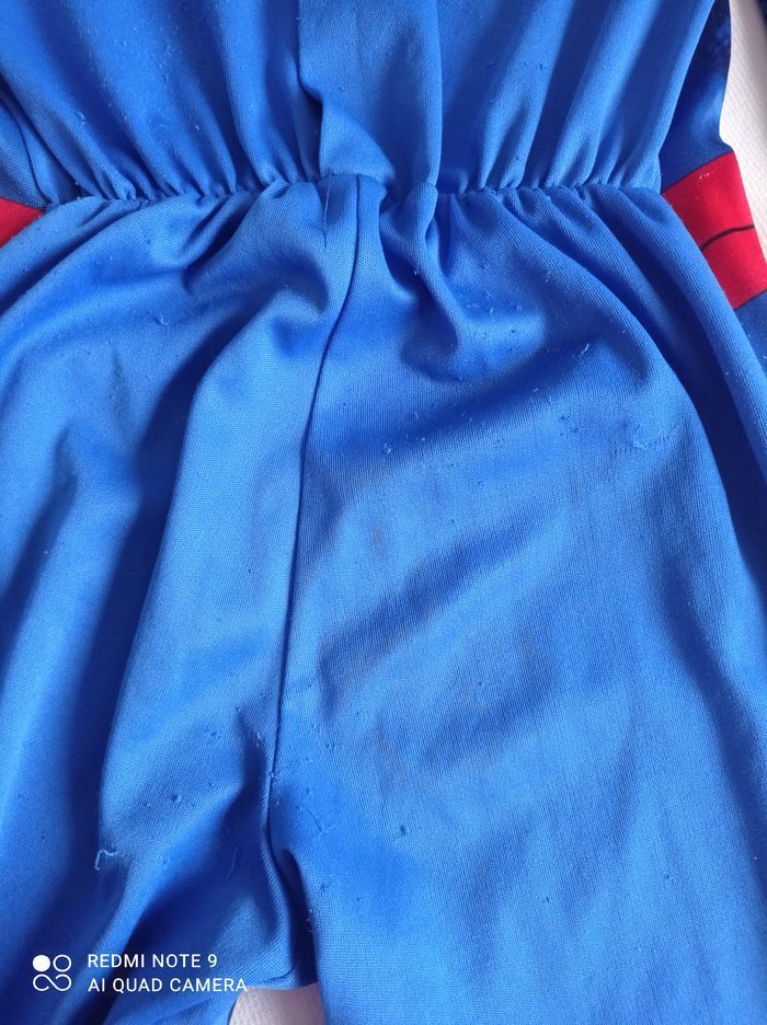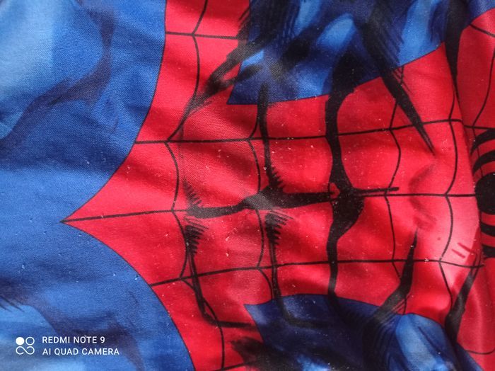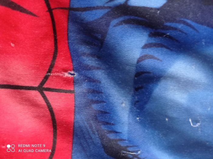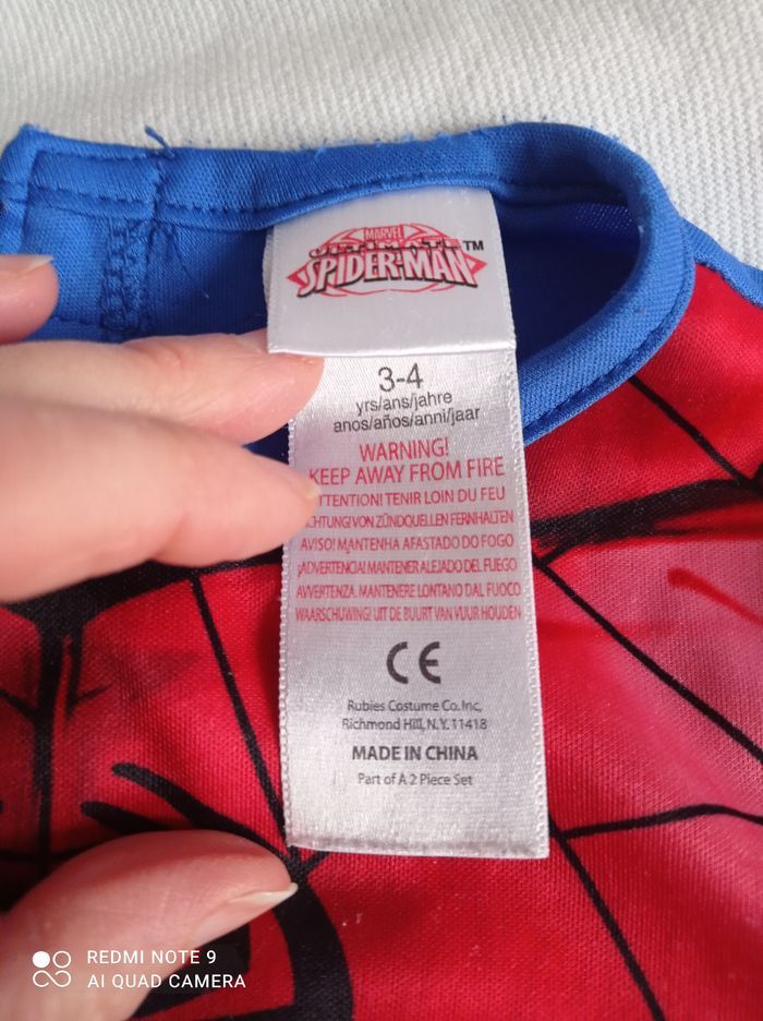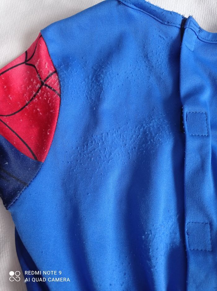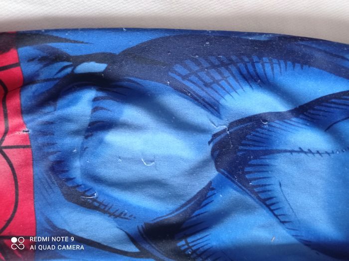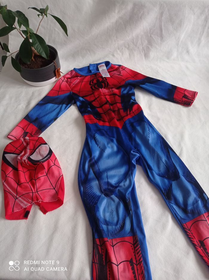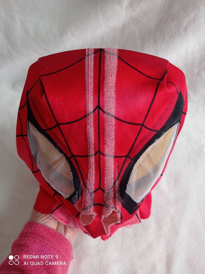 déguisement spiderman + masque tissu bien porté 3/4 ans masque effiliché Un mini trou sur déguisement comme sur photo Et scratch a accroché à certains endroits du déguisement