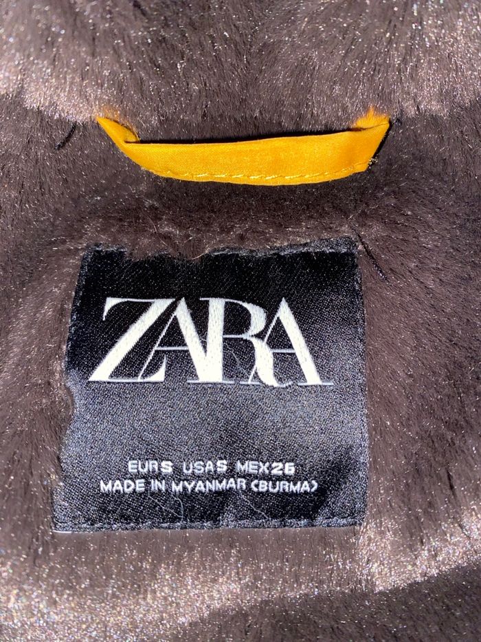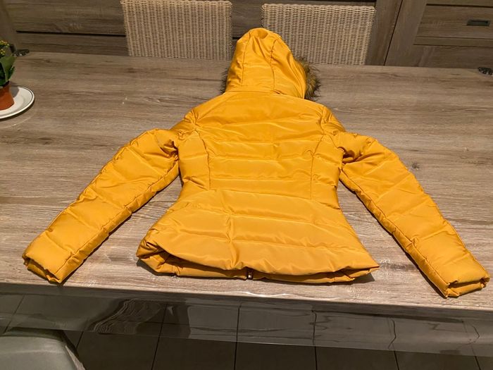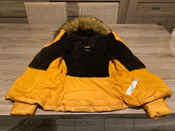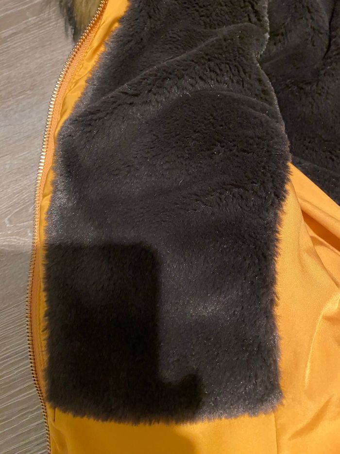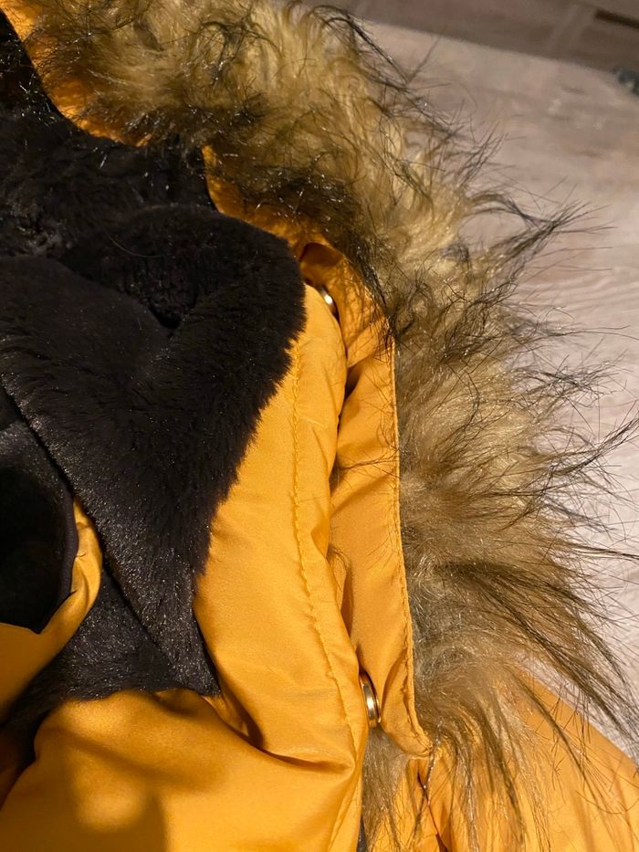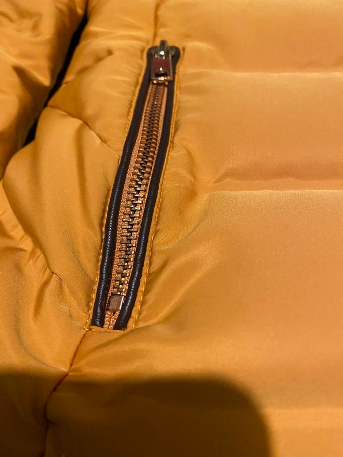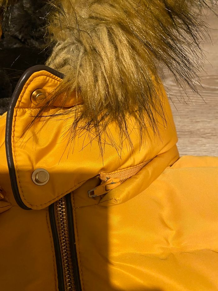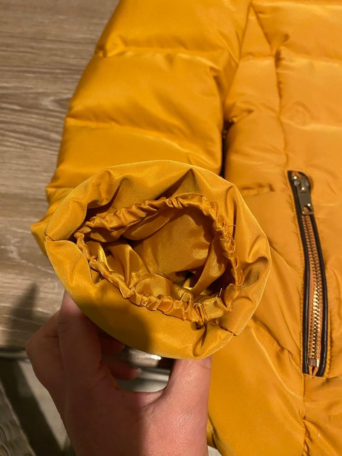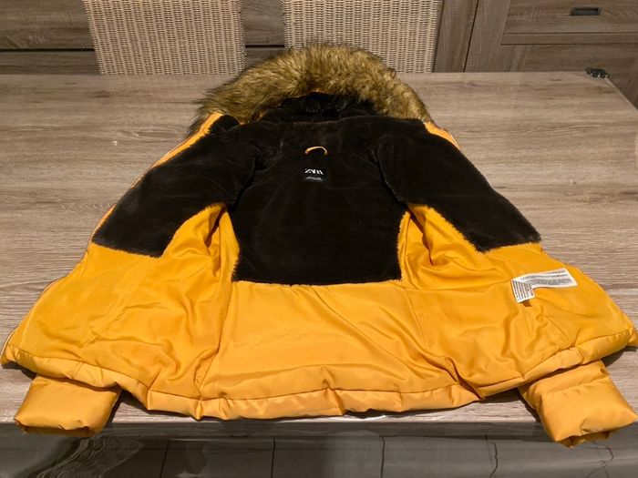 Très belle doudoune ZARA moutarde imperméabilisée. Intérieur ultra doux polaire chocolat La capuche et sa fourrure sont amovibles Fermeture zippée, 2 poches latérales également zippées, poignets resserrés. Parfaite pour l'hiver : chaude, confortable et en excellent état (portée qu'une seule fois).
