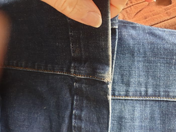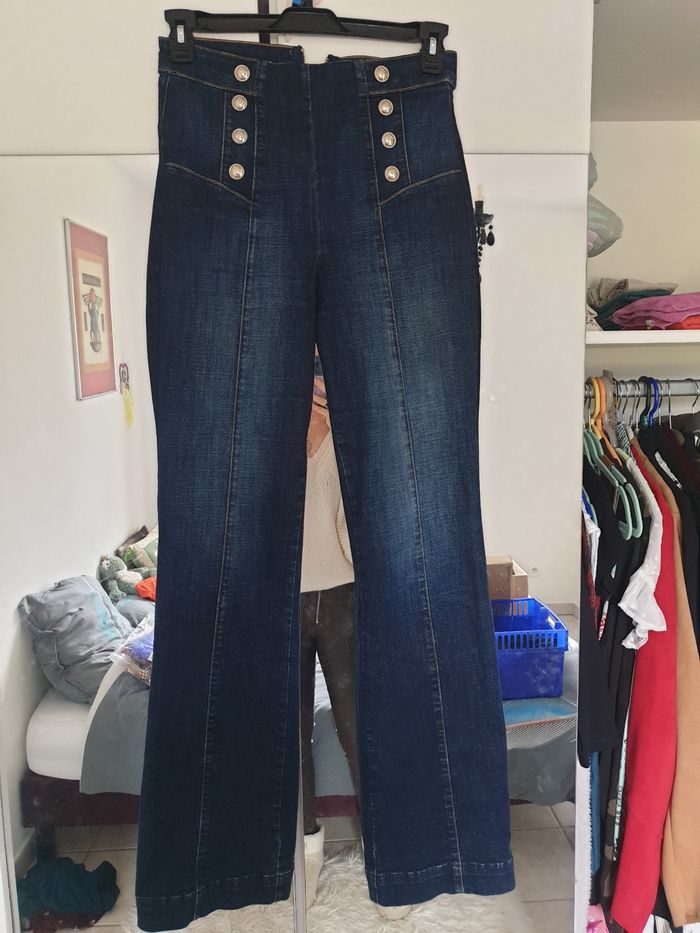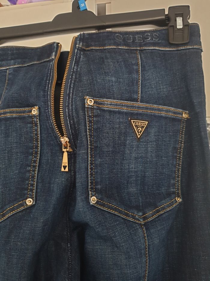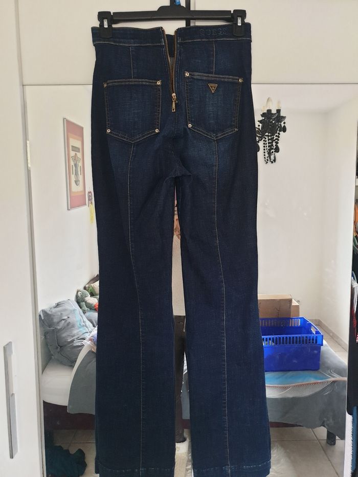 Jean Guess, avec fermeture éclair sur les fesses. Taille 42 mais recousu pour devenir taille 40, légèrement usé en bas derrière. Voir photo.