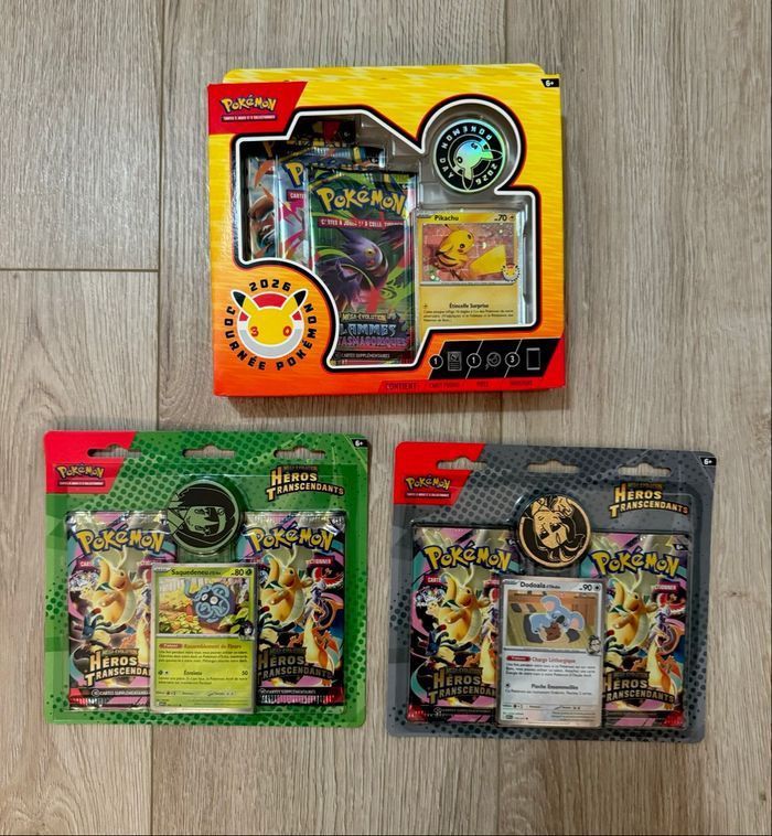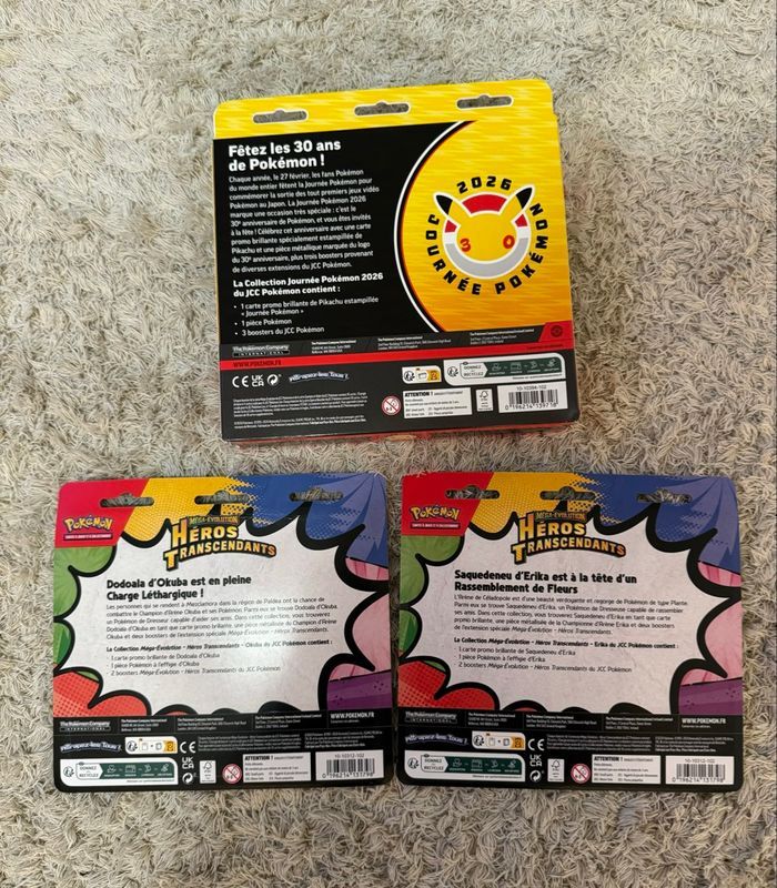 Lot de 3 items Pokémon : - 2 Duo pack ME02.5 Héros Transcendants. Art set complet (Dodoala et Saquedeneu). 4 boosters et 2 cartes promo au total. - 1 coffret Pokémon 30 ans (3 boosters) Neuf scellé jamais ouvert et en français.