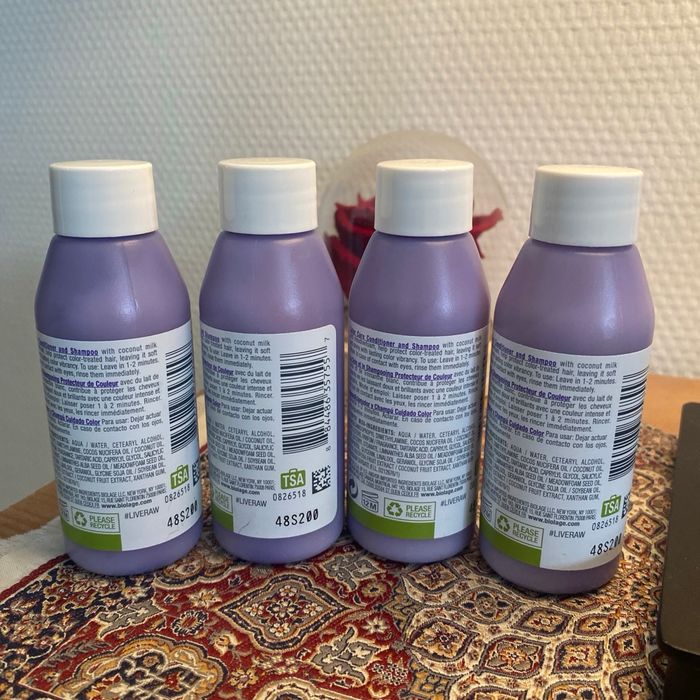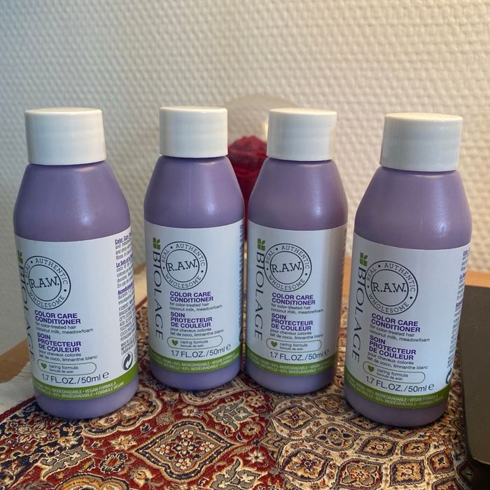 Lot de 4 flacons Biolage RAW SOIN PROTECTEUR DE COULEUR Pour cheveux colorés lait de coco, limnanthe blanc 50 ml Cet après-shampooing pour cheveux colorés aide à prolonger la couleur et brillance de la chevelure. Il nourrit en profondeur. Neufs et jamais ouverts