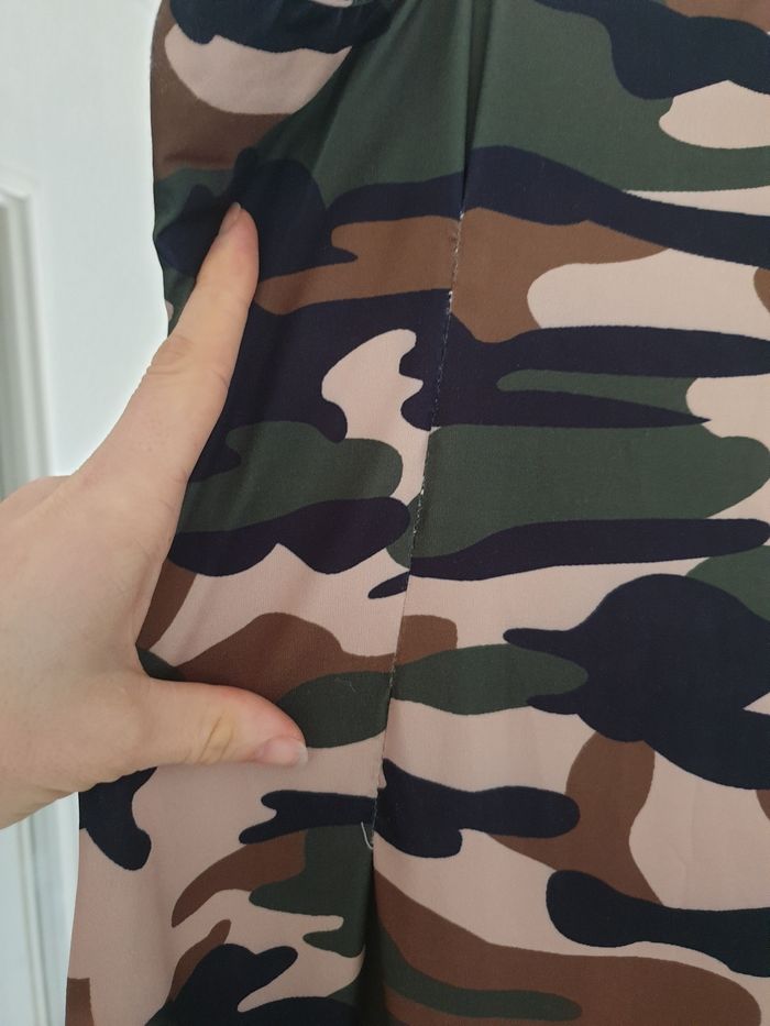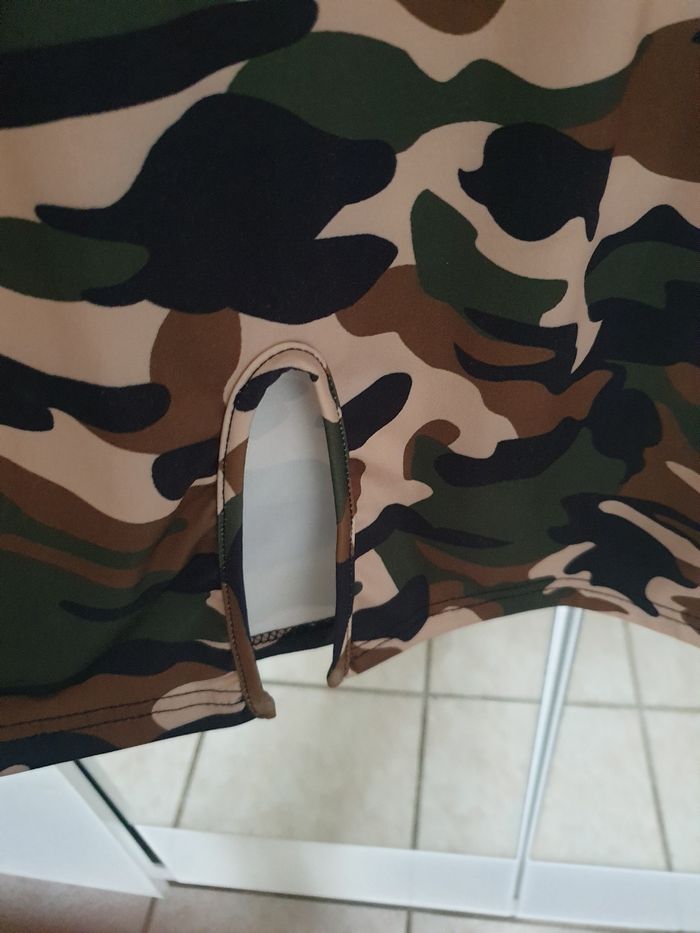 Robe militaire mi-longue, arrive mi-mollet, fendue derrière, j'ai cousu des pinces dans le dos pour un effet plus cintrés et l'ai raccourcie car était un peu grande.