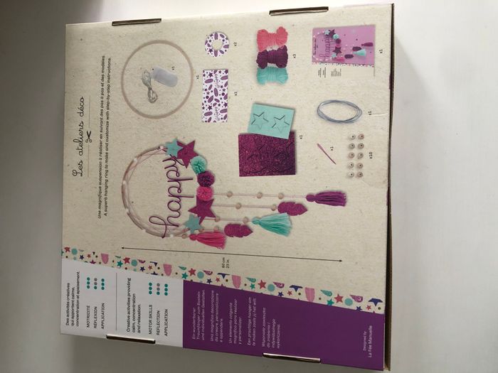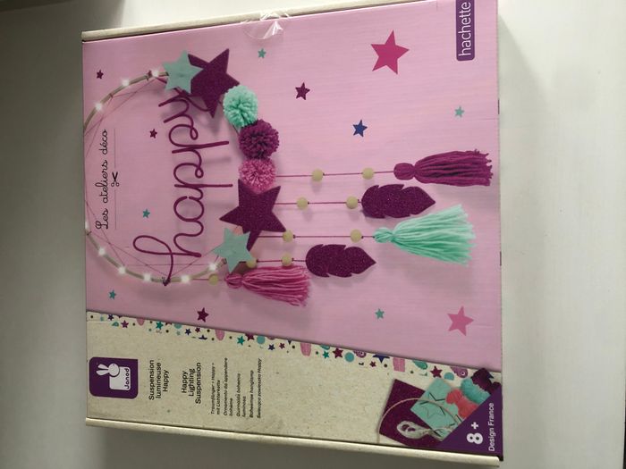 Comment ne pas être 'happy' en voyant cette magnifique suspension lumineuse à confectionner sur un cercle en bois ! Le rendu est superbe grâce à une vraie guirlande lumineuse, des pompons à réaliser soi-même et des feutrines à suspendre. Cette décoration murale très tendance, dans des tons roses/violets permet d'afficher un message positif, à offrir ou à garder pour embellir sa chambre. Cette activité créative pour les enfants à partir de 8 ans développe la motricité fine et la fibre artistique. Ce kit contient 1 cercle en bois, 1 guirlande lumineuse, 3 pelotes de laine, 1 câble en aluminium, 2 cercles en carton, de la feutrine et de la feutrine pailletée, 10 perles en bois, 1 aiguille en plastique et 1 livret explicatif. Dimensions de la déco : 24 cm de haut. Le cercle en bois fait 60 cm de diamètre.
