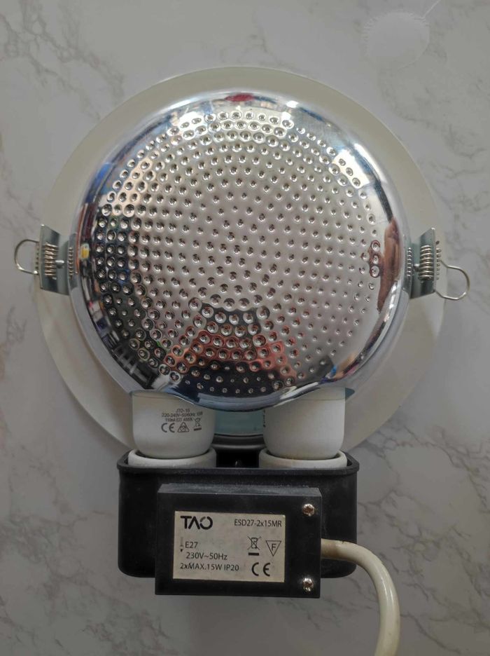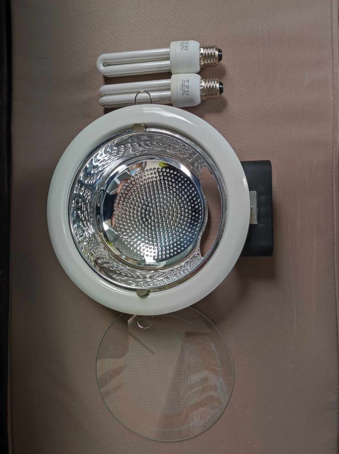 Plafonnier fixe IP20 Collerette en aluminium blanc Corps : En acier avec de l'acier d'armature Diffuseur : verre de protection sérigraphié Réflecteur : en aluminium métallisé Diamètre total : 23 cm Diamètre intérieur vitré : 18 cm Profondeur d'encastrement : 9 cm Couleur : Blanc Forme : Rond Indice de protection : 20 Température lumière : 4000 kelvins Tension électrique : 230 V Présence de ressorts en acier qui assurent une adhérence parfaite aux faux plafonds Ouverture de l'anneau avec verre à charnière pour faciliter les opérations d'entretien Boîtier à accessoires séparé de l'optique pour optimiser la dispersion de la chaleur Vendu avec 2 lampes fluocompactes E27 15W très peu servies Câblage conseillé non fourni : alimentation 220-240V 50/60Hz avec protection thermique. Poids : 825 gr