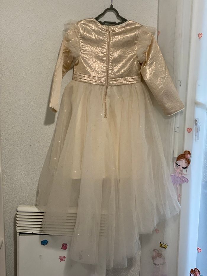 Magnifique robe élégante pour petite fille, marque Tape à l'Œil, taille 2,3 ans • Haut manches longues en tissu doré brillant • Epaules décorées de volants Jupe en tulle blanc avec paillettes scintillantes, effet princesse Dos avec fermeture discrète • Très bon état, portée seulement une fois. Idéale pour cérémonie, mariage, anniversaire ou toute occasion festive.