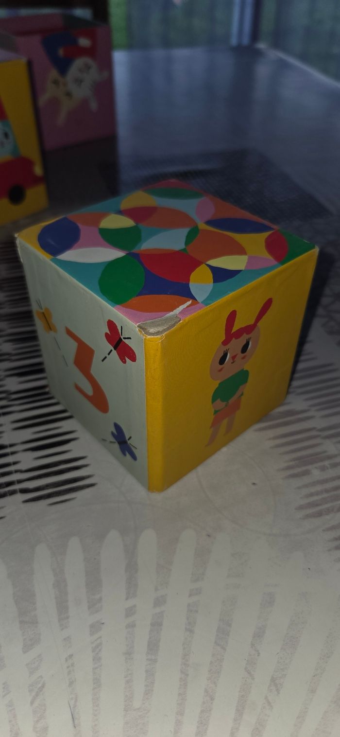 Jeu d empilage avec le chat Complet mais avec des imperfections sur les boîtes