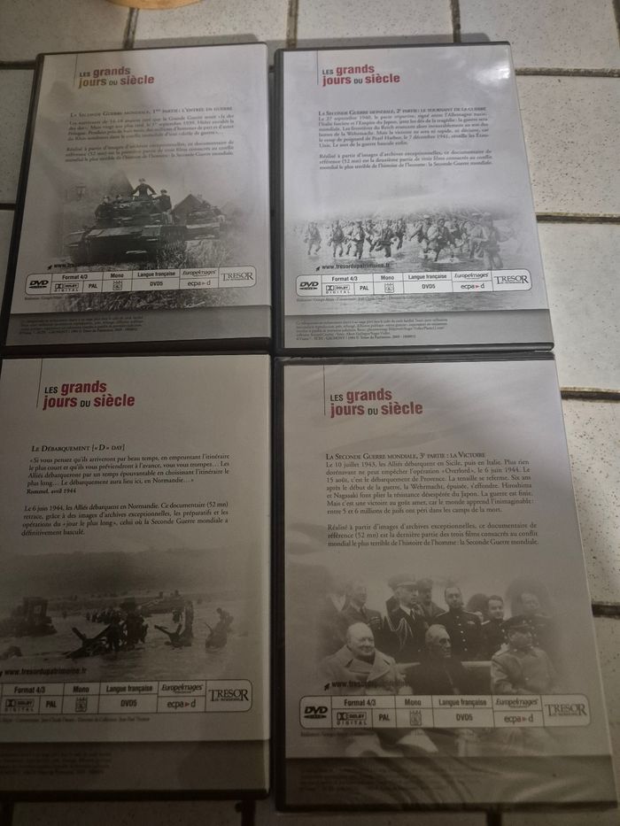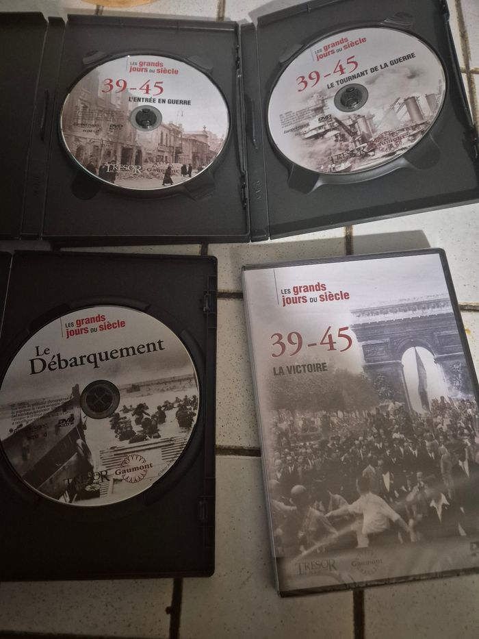 ​Je propose ce lot de 4 DVD documentaires de référence sur la Seconde Guerre Mondiale, issus de la collection "Les Grands Jours du Siècle" (Gaumont / Trésor du Patrimoine).​ Ces films sont indispensables pour comprendre le conflit à travers des images d'archives exceptionnelles et commentées. ​Composition du lot : ​39-45 : L'entrée en guerre 2. 39-45 : Le tournant de la guerre 3. Le Débarquement (D-Day) 4. 39-45 : La Victoire — ⚠️ NEUF SOUS CELLOPHANE (Le boîtier est encore scellé d'origine, jamais ouvert). ​État : ​Les 3 premiers DVD ont été visionnés mais sont en excellent état (boîtiers et disques propres). ​Le 4ème DVD ("La Victoire") est neuf sous film plastique. ​Langue : Français. ​Parfait pour un cadeau, pour un passionné d'histoire ou pour compléter une collection
