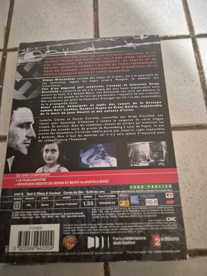 DVD du film documentaire historique "La Traque des Nazis", réalisé par Daniel Costelle et Isabelle Clarke (les auteurs de la série Apocalypse). ​Ce film retrace l'histoire de la traque des criminels de guerre depuis 1945, à travers les portraits de figures emblématiques comme Simon Wiesenthal et le couple Beate et Serge Klarsfeld. ​Points clés du DVD : ​Commentaire : Lu par l'acteur Mathieu Kassovitz. ​Contenu : De Nuremberg aux procès de Klaus Barbie et Maurice Papon. ​Bonus exceptionnel : Une interview inédite de Serge et Beate Klarsfeld d'une durée de 1h12. ​Durée du film : Environ 1h26. ​Langue : Français. ​État : ​Le boîtier et le disque sont en très bon état (voir photos). ​Le disque a été vérifié et ne présente pas de rayures gênantes pour la lecture.