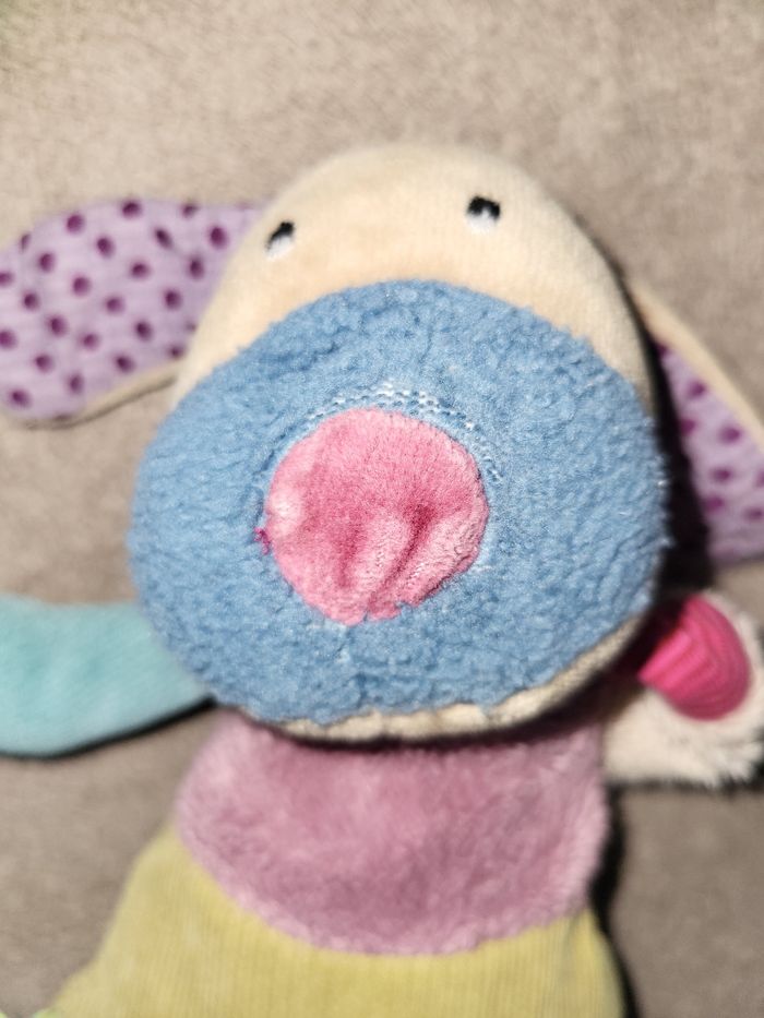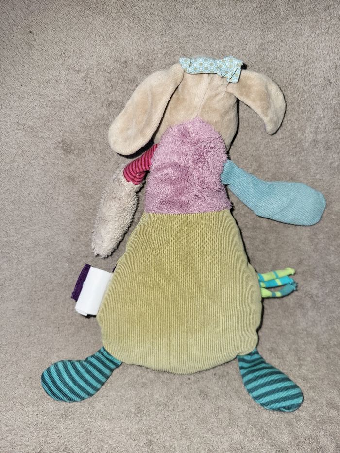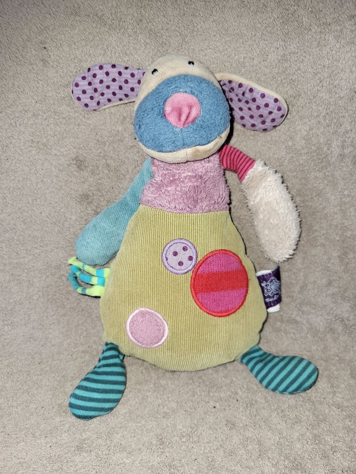 Doudou peluche chien multicolore Les jolis pas beaux Moulin roty Dimension environ 26cm Lavé plusieurs fois Léger frottement au niveaux du nez La collection les jolis pas beaux de Moulin Roty souffle un vent de créativité et d’humour. Cet univers d’animaux un peu décalés, plus jolis que pas beaux est remplis de doudous souris, chien et vache. Mais aussi de peluche de chat, mouton ou loup ! Moulin Roty propose une gamme de coloris originale : du prune, du taupe mêlés à du turquoise pour les modèles plus garçons. Et pour les filles, une touche de fuchsia éveillera les pupilles. Le velours de la collection les jolis pas beaux se mêle à des tissus uniques, de la peluche ou des broderies ! Chaque création est originale et harmonieuse. Dans le coffre des jolis pas beaux, vous trouverez des doudous, des peluches traditionnelles, des peluches d’éveil, des tapis d’activité, des mobiles …et pour les plus grands qui vont déjà à l’écoles pensez aux cartables et aux sac à dos. Côté déco rien n'est oublié pour la chambre de bébé, tables et chaises, stickers, tableaux …. Côté textile, les pyjamas et les gigoteuses existent en plusieurs tailles, en matière hiver ou été. #virgy61joueteveil #virgy61puericulture