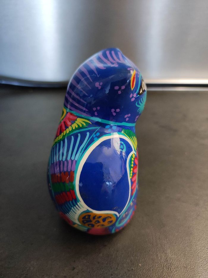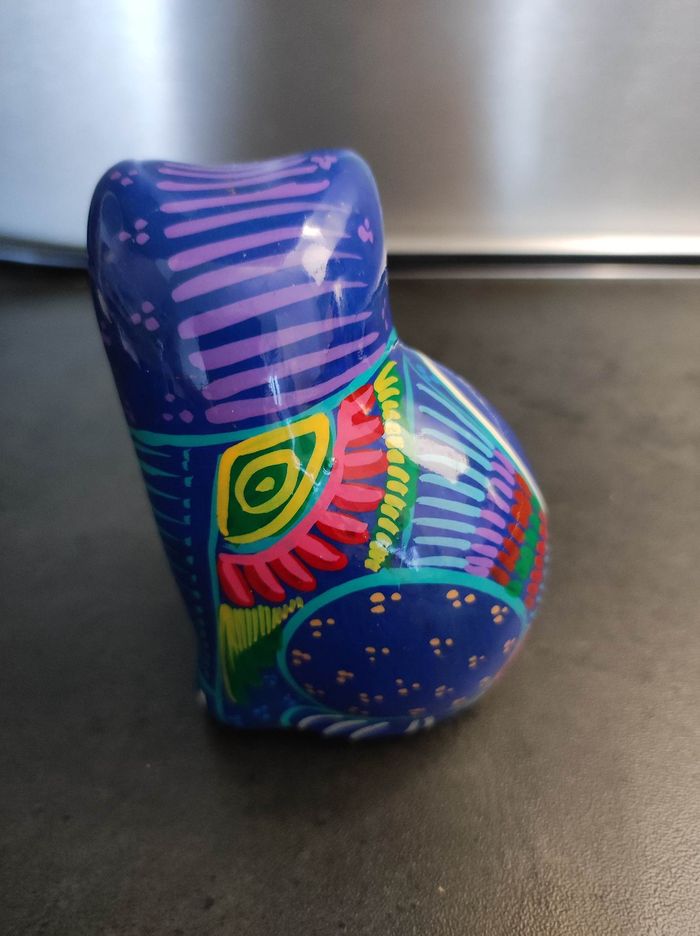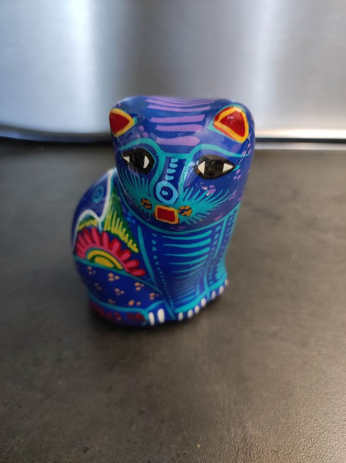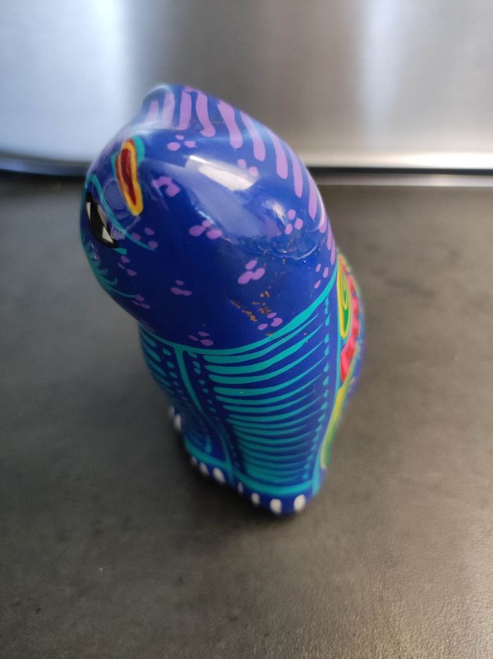 Chat très coloré Dimensions : 5L x 6l x 8,5H cm Matière : céramique creuse Aucun impact, état parfait Poids : 90 gr